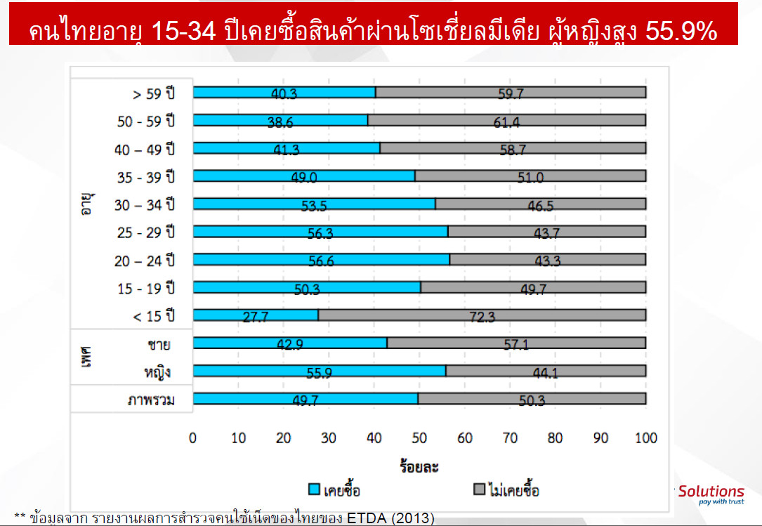 เอกราช ศาลยุติเดช ประธานฝ่ายปฏิบัติการ บริษัทเพย์ โซลูชั่น จำกัดเผย “บริการเพย์โซเชียลมีการทดลองให้ผู้ประกอบการ (Start Up) ได้เริ่มทดลองใช้บริการมานานกว่า 10 เดือน โดยมีผู้สมัครแรกเริ่ม 1,300 ราย และยังคงใช้งานในบัญชีอย่างต่อเนื่องถึง 450 รายและมีร้านค้าที่มีมูลค่าการซื้อขายถึง 2,000,000 บาทต่อเดือนเป็นจำนวนกว่า 800 รายการ โดยราคาเฉลี่ยของสินค้าที่รับชำระค่าบริการผ่านเพย์ โซเชียลอยู่ที่ประมาณ 2,500 บาทต่อรายการ ทั้งนี้สืบเนื่องมาจากการเจริญเติบโตของตลาดโซเชียลคอมเมิร์ซที่มีแนวโน้มว่าจะสูงขึ้น และมีกำลังซื้อเพิ่มขึ้นอย่างต่อเนื่อง ซึ่งในขณะนี้เพย์ โซเชียลได้มีการผนึกกำลังกับคู่ค้าทางธุรกิจอย่าง Visa ในการให้ส่วนลด 5% สำหรับลูกค้าผู้ใช้งานและชำระเงินผ่านบัตรวีซ่า และ Active Shop สำหรับผู้ขาย เมื่อมียอดรับชำระเงินขั้นต่ำ 3 รายการผ่านบัตรวีซ่า ด้วยยอดรวมไม่น้อยกว่า 1,500 บาท รับทันทีเครดิตเงินคืน 500 บาท”