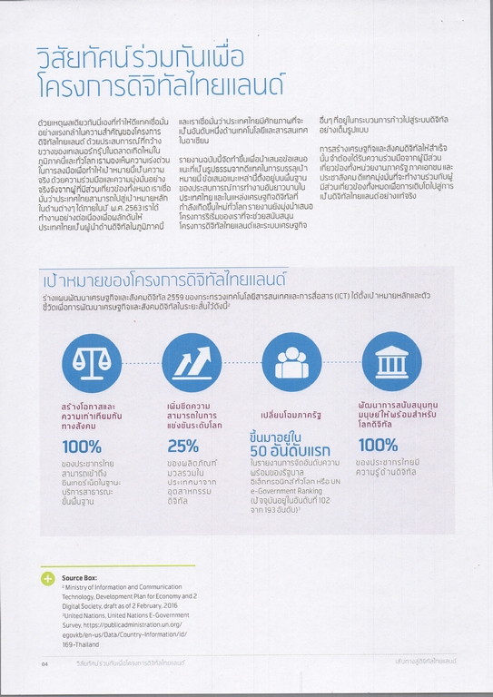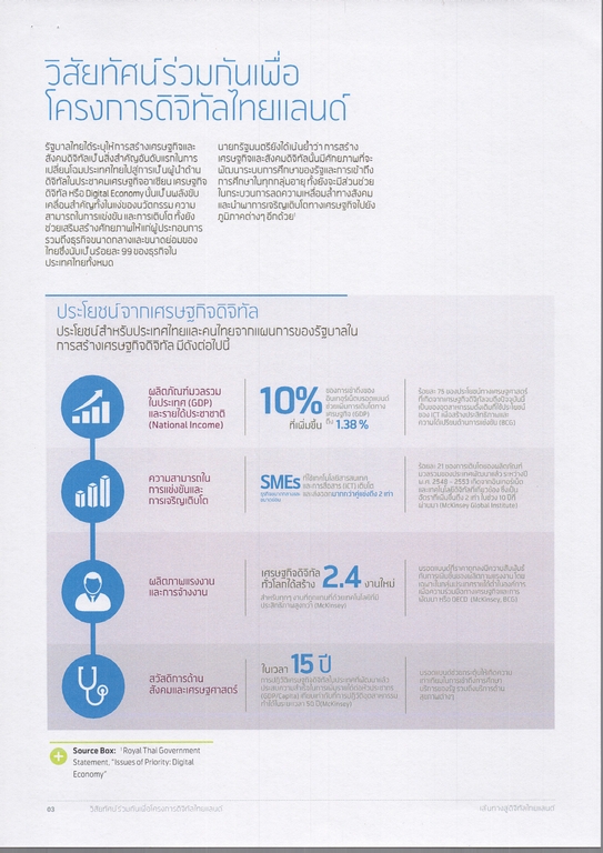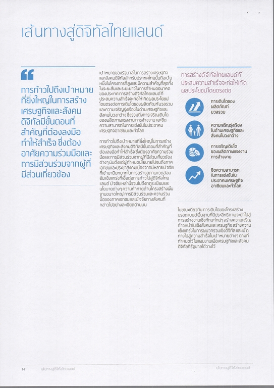 โดยรายงานฉบับนี้ จะช่วยผลักดันประสิทธิภาพของเศรษฐกิจดิจิทัล ที่จะมีบทบาทต่อการเปลี่ยนแปลงอุตสาหกรรมและส่งผลต่อการยกระดับคุณภาพชีวิตของประชาชนให้ชัดเจนยิ่งขึ้น และทำหน้าที่เป็นแรงผลักดันสู่นวัตกรรมเชิงมหภาคและการเติบโตที่สำคัญของชาติ ซึ่งดำเนินการสอดคล้องกับนโยบายของรัฐบาลและกระทรวงเทคโนโลยีสารสนเทศและการสื่อสาร และยังระบุถึงความท้าทายและโอกาสที่จะพัฒนาเศรษฐกิจดิจิทัลของชาติ และเพิ่มศักยภาพทางการแข่งขันสำหรับอุตสาหกรรมไทยในกลุ่มประเทศอาเซียน หรือประเทศอื่นอีกด้วย