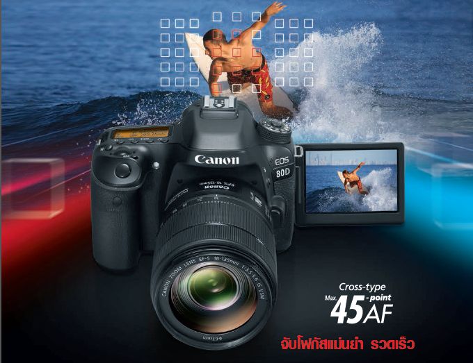 แคนนอนเปิดตัวกล้อง DSLR รุ่น Canon EOS 80D พร้อมเลนส์นาโนตัวใหม่ล่าสุด EF-S18-135mm f/3.5-5.6 IS USM (Nano) ที่ใช้ร่วมกับอุปกรณ์เสริมรุ่นใหม่ล่าสุด Power Zoom Adapter PZ-E1 โดยกล้อง EOS 80D มาพร้อมฟีเจอร์เด่น เช่น ระบบออโต้โฟกัสแบบ cross type ทั้งหมด 45 จุด ชิปประมวลผลภาพ DIGIC 6 ที่ทำงานร่วมกับเซนเซอร์ CMOS ความละเอียด 24.2 ล้านพิกเซล และค่า ISO ที่ขยายได้ถึง ISO 25600