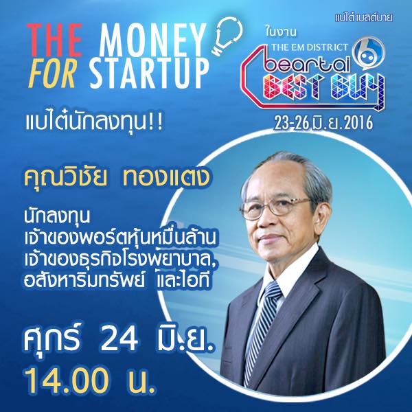 - 14.00 – 15.00 น. The Money for Startup พูดคุยกับคุณวิชัย ทองแตง นักลงทุนเจ้าของพอร์ตหุ้นระดับแสนล้าน