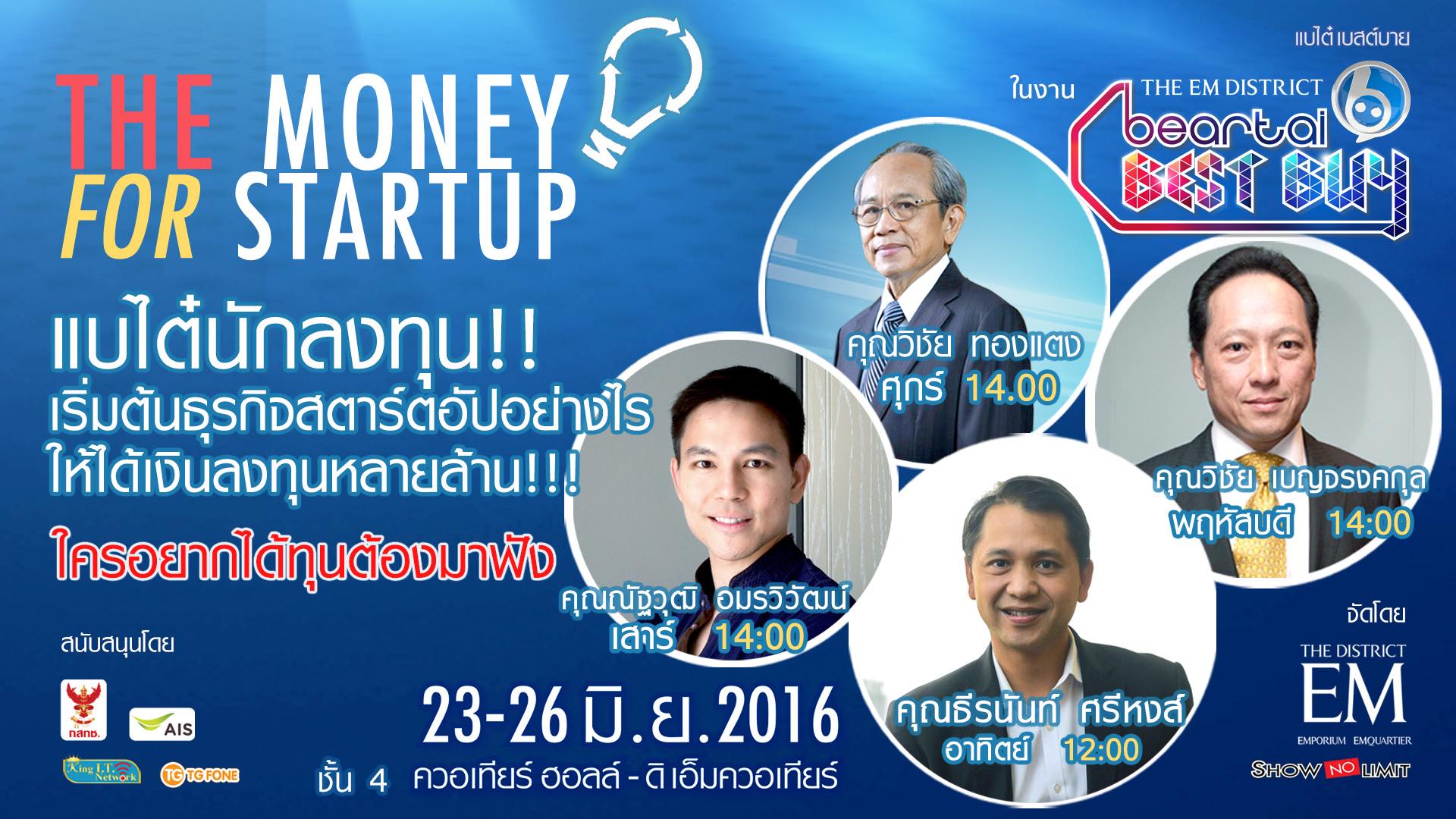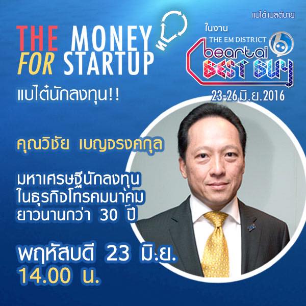 - 14.00 – 15.00 น. The Money for Startup พูดคุยกับคุณวิชัย เบญจรงคกุล มหาเศรษฐีนักลงทุน
