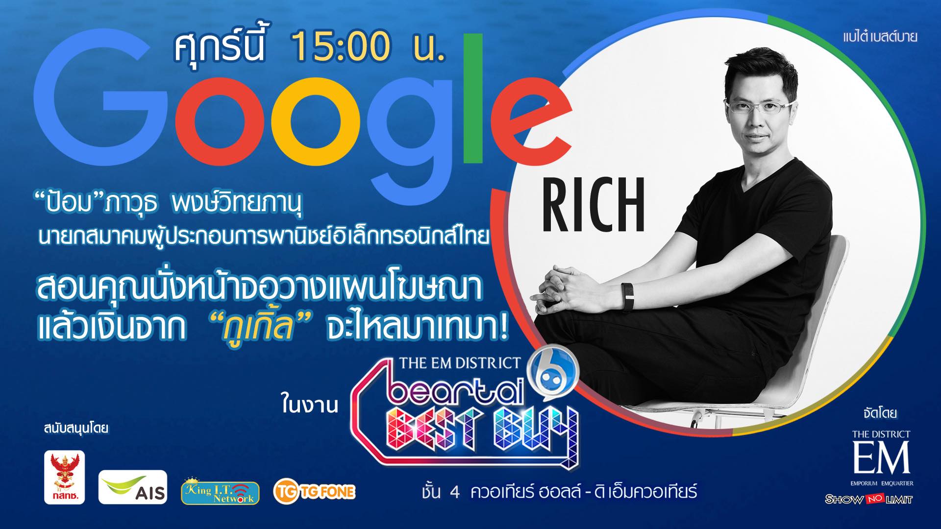 - 15.00 – 16.00 น. Google Rich สอนนั่งหน้าจอให้เงินไหลมาเทมากับป้อม-ภาวุธ พงษ์วิทยภานุ นายกสมาคมผู้ประกอบการพาณิชย์อิเล็กทรอนิกส์ไทย