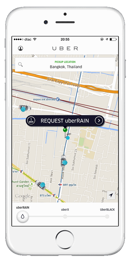 โปรโมชั่นพิเศษรับฝนกระหน่ำเฉพาะการเรียก Uber ในวันศุกร์ที่ 8 ก.ค. ช่วง 17.00 – 20.00 น. เท่านั้น กับ UberRAIN รถพิเศษที่มาพร้อมร่มดีไซน์เก๋ๆ จากอูเบอร์ที่แจกให้ฟรีสำหรับลูกค้าที่เรียกรถ