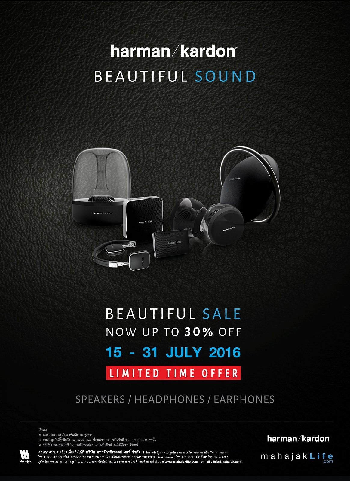 Harman /Kardon Beautiful Sound Beautiful Sale มหกรรมลดราคาเครื่องเสียงแบรนด์ระดับโลกอย่าง Harman /Kardon โดยลดราคาสูงสุด 30% ตั้งแต่วันที่ 15-31 ก.ค. 2559 ที่ร้านค้าตัวแทนจำหน่ายทั่วประเทศ