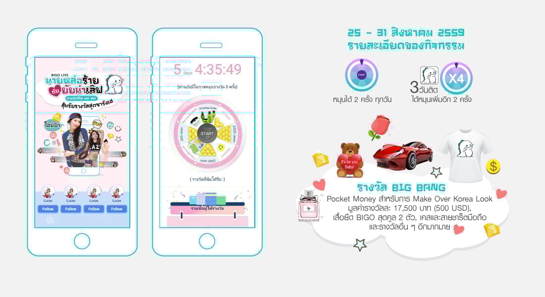- เงินสดมูลค่า 500 USD พร้อมทั้ง เสื้อยืด BIGO สุดน่ารัก 2 ตัว , เคสโทรศัพท์มือถือ และสายชาร์จ ลายลิขสิทธิ์แท้จาก BIGO