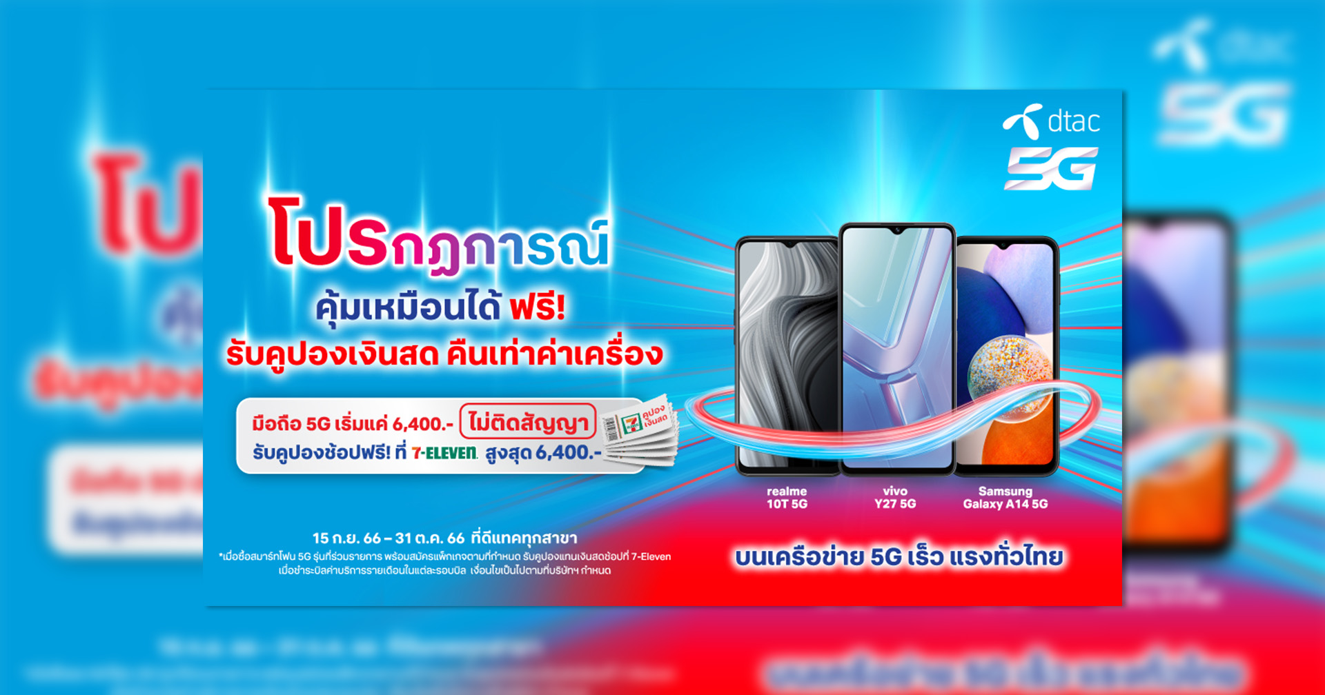 พบข้อเสนอสุดคุ้ม….ทรู ดีแทค Better Together รวมกันแล้วได้มากกว่าเดิม กับ โปรกฎการณ์เลือกได้ตามใจ ตอบโจทย์ทุกไลฟ์สไตล์ คุ้มเหมือนได้ฟรี เลือกรับเงินคืน เท่าค่าเครื่อง เมื่อซื้อมือถือ 5G รุ่น realme 10T 5G, vivo Y27 5G, Samsung Galaxy A14 5G ราคาเริ่มต้นเพียง 6,400 บาท ไม่ติดสัญญา รับคูปองแทนเงินสดรวมสูงสุด 6,400 บาท ใช้ช้อปฟรีทุกเดือนที่ 7-Eleven