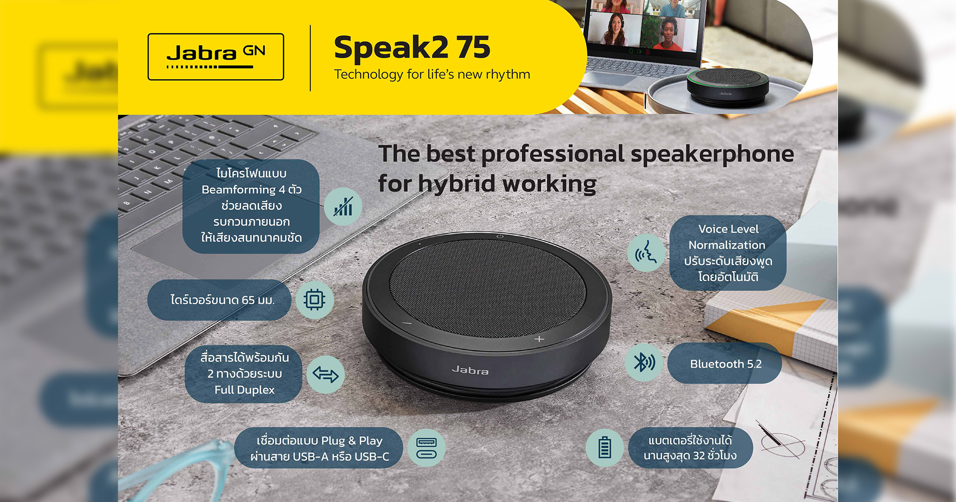 ลำโพงประชุมไร้สายระดับมืออาชีพที่ดีที่สุดสำหรับการทำงานแบบไฮบริด มาพร้อมเทคโนโลยี Voice Level Normalization ซึ่งเป็นเทคโนโลยีล่าสุดจาก Jabra ที่จะช่วยปรับระดับเสียงพูดโดยอัตโนมัติ ดังนั้น ไม่ว่าเสียงที่พูดจะเบาหรือดัง หรือนั่งไกลหรือใกล้ คู่สนทนาก็จะได้ยินอย่างคมชัด คุณภาพเสียงยอดเยี่ยมด้วย Super-wideband Audio ทำให้ตอบสนองได้ทุกย่านความถี่เสียง ด้วยไมโครโฟนแบบ Beamforming จำนวน 4 ตัว จะช่วยลดเสียงรบกวนจากภายนอก ทำให้เสียงสนทนาคมชัด สดใส และไดร์เวอร์ขนาด 65 มม. รองรับทั้งการทำงานและการฟังเพลงผ่านระบบ Advanced Full Duplex ที่ช่วยให้สื่อสารได้พร้อมกัน 2 ทาง ทำให้สนทนาได้อย่างลื่นไหล เป็นธรรมชาติ ใช้งานง่ายด้วยการเชื่อมต่อแบบไร้สายผ่านบลูทูธ (Bluetooth 5.2) และแบบใช้สายผ่าน USB-A หรือ USB-C มี Dual Bluetooth connectivity ช่วยให้เชื่อมต่อผ่านบลูทูธได้พร้อมกัน 2 อุปกรณ์ และสามารถสลับการใช้งานระหว่างสมาร์ตโฟนและแล็ปท็อปได้อย่างง่ายดาย. ไมโครโฟนรับเสียงได้ในระยะ 2.5 เมตรและเชื่อมต่อผ่านบลูทูธได้ไกลสุดถึง 30 เมตร จับคู่ได้สูงสุด 8 อุปกรณ์