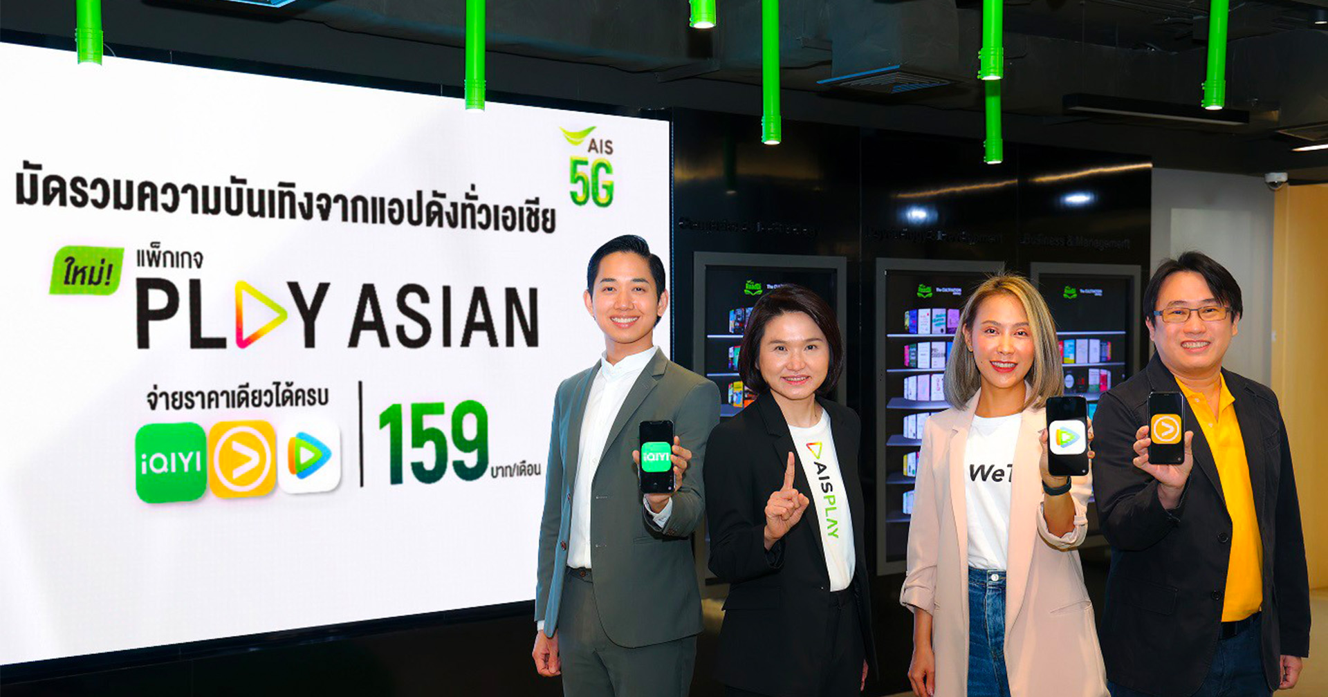 ลูกค้าสามารถรับชมคอนเทนต์สุดพรีเมียมระดับเอเชีย ไม่ว่าจะเป็นจะเป็นแพลตฟอร์ม iQIYI (อ้ายฉีอี้) แพลตฟอร์มที่ได้รับการโหวตจากแฟนๆ ทั่วทั้งเอเชียในการเป็นหมุดหมายสำคัญสำหรับการรับชมคอนเทนต์คุณภาพ ไม่ว่าจะเป็น ซีรีส์จีน ซีรีส์วาย วาไรตี้ ภาพยนตร์ และอนิเมะ ที่ดีที่สุดทั่วเอเชียกว่า 4,000 คอนเทนต์ และยังเป็นแพลตฟอร์มที่เติบโตแบบก้าวกระโดดสร้างกำไรติดกัน 3 ไตรมาสอย่างต่อเนื่อง, VIU แพลตฟอร์ม OTT ที่เติบโตอย่างรวดเร็วจากความนิยมของผู้บริโภคชาวไทยด้วยจุดเด่นจากการรวมซีรีส์เกาหลีมาให้แฟนๆ ได้รับชมก่อนใคร สดใหม่ และ WeTV สุดยอดสตรีมมิ่งแพลตฟอร์มจากจีนที่รวมคอนเทนต์ทั่วทั้งเอเชียรวมกว่า 1,200 คอนเทนต์ ทั้งซีรีส์ อนิเมะ รายการวาไรตี้ จากจีน ไทย เกาหลี ญี่ปุ่น สามารถสมัครแพ็ก PLAY ASIAN แบบง่าย ๆ เพียงกด 678159# โทรออก และรายละเอียดเพิ่มเติมได้ที่ https://m.ais.co.th/ASN159Bfb