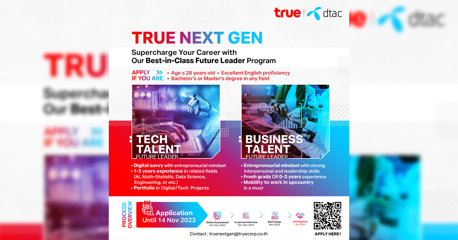 โดยครั้งนี้ True Next Gen ได้รับการออกแบบ เพื่อยกระดับเส้นทางอาชีพผ่านประสบการณ์ตรงและการมอบหมายงานจริง เพื่อเตรียมพร้อมสู่การเป็น “ผู้นำแห่งอนาคต” ของทรู คอร์ปอเรชั่น แบ่งออกเป็น 2 แทรค ตามคุณสมบัติที่ต้องการ ได้แก่ 1. Tech Talent และ 2. Business Talent โดยมีคุณสมบัติดังนี้