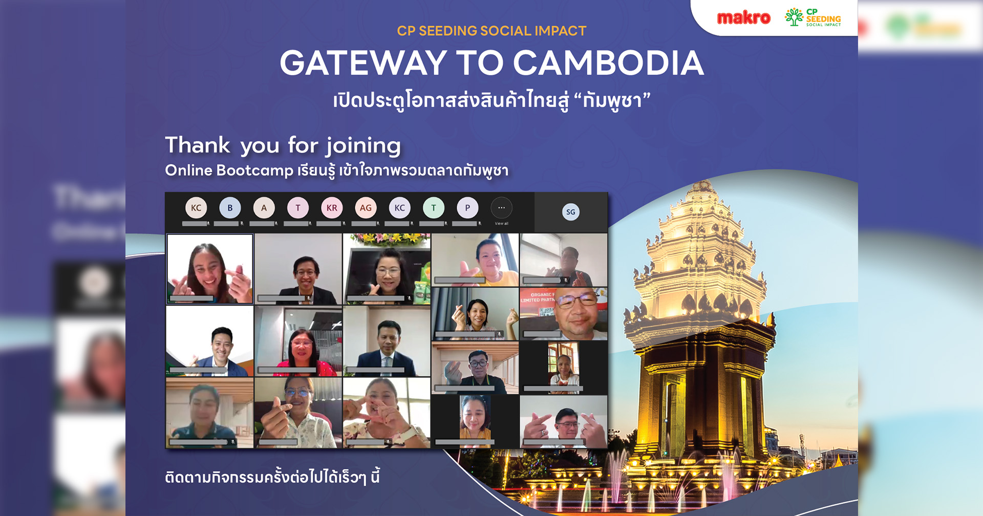 ล่าสุด บริษัท ซีพี ซีดดิ้ง โซเชียลอิมแพคท์ จำกัด ได้เดินหน้าโครงการ Gateway to Global อย่างต่อเนื่อง เพื่อมุ่งสร้างโอกาสผู้ประกอบการไทยนำสินค้า made in Thailand เข้าสู่ตลาดโลก ด้วยกิจกรรม GATEWAY TO CAMBODIA THE SERIES เพื่อเปิดโอกาสทางการค้าแก่ผู้ประกอบการไทยในการเข้าสู่ตลาดกัมพูชา ประเทศคู่ค้าสำคัญในอาเซียน ผ่านกระบวนการเรียนรู้เข้าใจตลาด ทดลองตลาด และเข้าสู่ตลาด โดยเริ่มเปิดประตูแรก ผ่านกิจกรรม GATEWAY TO CAMBODIA ONLINE BOOT-CAMP เพื่อให้ความรู้เกี่ยวกับภาพรวมเศรษฐกิจ พฤติกรรมการบริโภค การเตรียมตัวเข้าตลาดโมเดิร์นเทรดในกัมพูชา และการทำธุรกรรมการค้าระหว่างประเทศ โดยมีผู้เชี่ยวชาญจากสำนักงานส่งเสริมการค้าระหว่างประเทศ ณ กรุงพนมเปญ, ซีพี แอ็กซ์ตร้า และ ธนาคารเพื่อการส่งออกและนำเข้าแห่งประเทศไทยร่วมแบ่งปันความรู้ และเปิดโอกาสในการขยายตลาดร่วมกับ ซีพี ซีดดิ้ง โซเชียลอิมแพคท์ แก่ผู้ประกอบการไทย โดยมีผู้ประกอบการจากทั่วประเทศเข้าร่วมอบรมผ่านช่องทางออนไลน์อย่างคับคั่ง