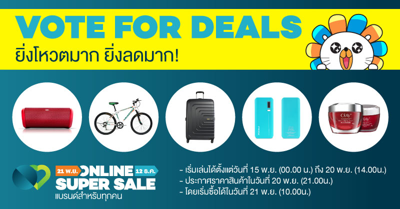 มากไปกว่านั้น ลาซาด้ายังได้จัดกิจกรรมบนเว็บไซต์เพื่อมอบส่วนลดพิเศษที่เพิ่มขึ้นจากสินค้าอื่นๆ และเพื่อให้นักช้อป ได้ช้อปปิ้งสินค้าบนเว็บไซต์ www.lazada.co.th/online-super-sale มีความสนุกสนานมากยิ่งขึ้น ด้วยกิจกรรม Vote Your Deal ที่จะมีขึ้นใน วันที่ 15 – 20 พฤศจิกายน โดยจะมอบโอกาสการซื้อสินค้าในราคาที่ถูกลงแก่นักช้อปทั้งหลายด้วยการโหวต นักช้อปเพียงแค่กด “ถูกใจ” สินค้าที่ชื่นชอบมากที่สุดสามชิ้นที่ต้องการให้ราคาถูกลง แล้วชักชวนเพื่อนให้ทำเช่นเดียวกัน โดยลาซาด้าจะประกาศสินค้าที่ได้รับการโหวตให้มีส่วนลดมากที่สุดในวันที่ 20 พฤศจิกายน ซึ่งนักช้อปจะสามารถเริ่มเข้าไปช้อปสินค้าดังกล่าวได้ตั้งแต่วันที่ 21 พฤศจิกายน เป็นต้นไป