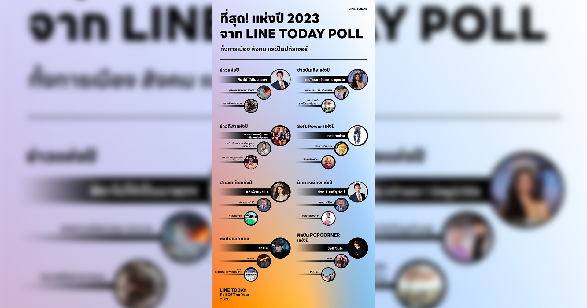 ปี 2023 เกิดเหตุการณ์มากมายหลายอารมณ์ในทุกมิติ ทั้งสังคม การเมือง วัฒนธรรม และไลฟ์สไตล์ เราได้เห็นกระแสความเห็นอันหลากหลาย ล่าสุดทาง LINE TODAY จัดทำ LINE TODAY POLL OF THE YEAR 2023 โพลแห่งปี เพื่อรวมแง่มุมและประเด็นฮิตให้เหล่ามหาชนออนไลน์ร่วมโหวตระหว่างวันที่ 4 – 20 ธันวาคมที่ผ่านมา พบ “ข่าวพิธาหลุดนายก” มาแรงอันดับ 1 ข่าวแห่งปี “กางเกงช้าง” รั้งที่1 ซอฟต์พาวเวอร์