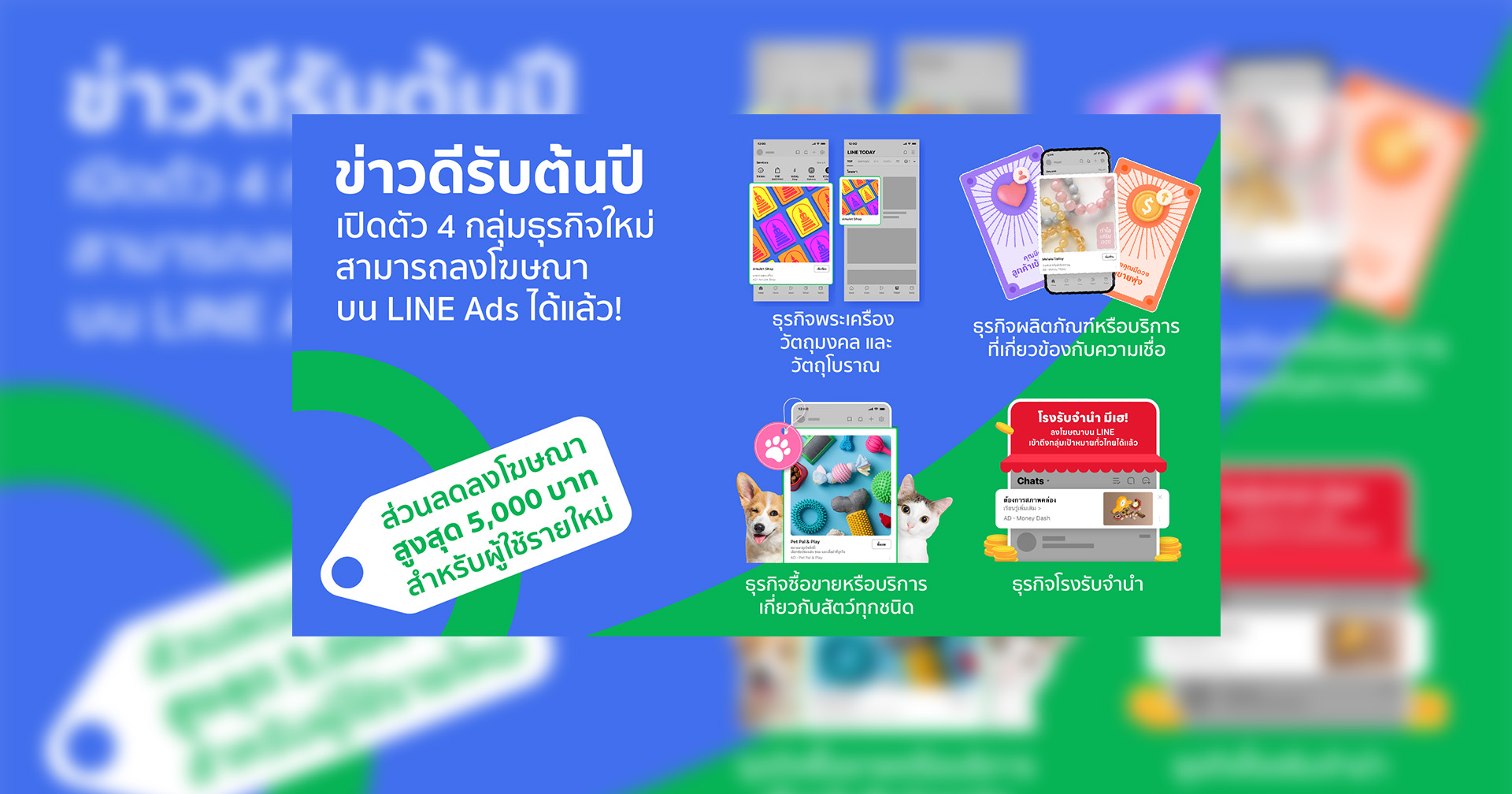 LINE for Business เข้าใจถึงความจำเป็นของการโฆษณาธุรกิจบนโลกออนไลน์ โดยเฉพาะบน LINE ช่องทางยอดนิยมในการทำธุรกิจของคนไทย จึงเร่งขยายขอบเขตการให้บริการให้ครอบคลุมประเภทธุรกิจให้มากที่สุด โดยมี LINE Ads ระบบการลงโฆษณาบน LINE เป็นตัวช่วยให้ธุรกิจสามารถเข้าถึงและสื่อสารกับลูกค้าของตนได้อย่างแม่นยำ ผ่านการแสดงผลโฆษณาบนตำแหน่งต่างๆ ที่หลากหลายบน LINE โดยมีกลุ่มธุรกิจที่เปิดใหม่ล่าสุด ดังนี้