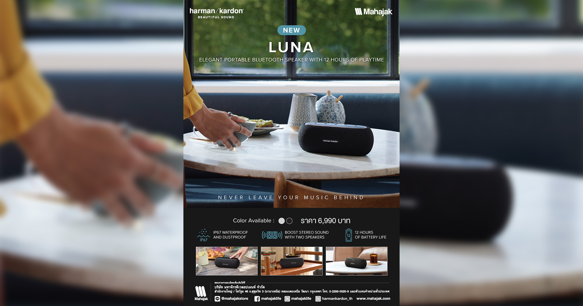 มีให้เลือก 2 สี ทั้งสีเทาเงินสุดเรียบหรู และ สีดำสุดเท่ ราคา 6,990 บาท สามารถหาซื้อได้แล้วที่ Showroom มหาจักรทุกสาขา, ร้าน SoundCity ทุกสาขา, และร้านค้าตัวแทนจำหน่ายที่ร่วมรายการ หรือ Shop Online ได้ที่ >> https://www.mahajak.com/th/luna-harman-kardon.html