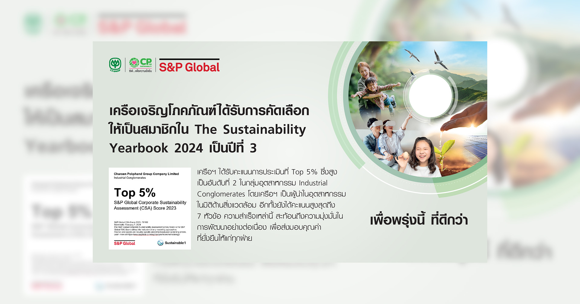 เครือเจริญโภคภัณฑ์ หรือ CP Group ถูกประกาศให้เป็นองค์กรที่มีความยั่งยืนโดดเด่น โดยได้รับการประเมินด้านความยั่งยืนระดับ “Top 5%” ในกลุ่มอุตสาหกรรม Industrial Conglomerates ต่อเนื่องเป็นปีที่ 3 ในรายงาน The Sustainability Yearbook 2024 จาก S&P Global โดยเป็นบริษัทที่มีผลการดำเนินการด้านความยั่งยืนอยู่ใน Top 5% สูงสุดจากจำนวนบริษัทที่เข้าร่วมการประเมินฯ ในอุตสาหกรรมเดียวกันทั้งหมด 102 บริษัท กล่าวได้ว่าเป็นผู้นำในอุตสาหกรรมในมิติด้านสิ่งแวดล้อม ทั้งยังได้คะแนนสูงสุดมากถึง 7 หัวข้อ ถือเป็นเอกชนไทยรายเดียวที่ติดอันดับในกลุ่มอุตสาหกรรมดังกล่าวร่วมกับ SK Inc ธุรกิจโทรคมนาคมจากสาธารณรัฐเกาหลี Siemens AG บริษัทเทคโนโลยีของเยอรมัน Keppel Corporation Ltd. ผู้เชี่ยวชาญในธุรกิจนอกชายฝั่งและทางทะเลของสิงค์โปร์ และ Samsung C&T Corporation บริษัทชั้นนำด้านวิศวกรรมและการก่อสร้างระดับโลกจากสาธารณรัฐเกาหลี