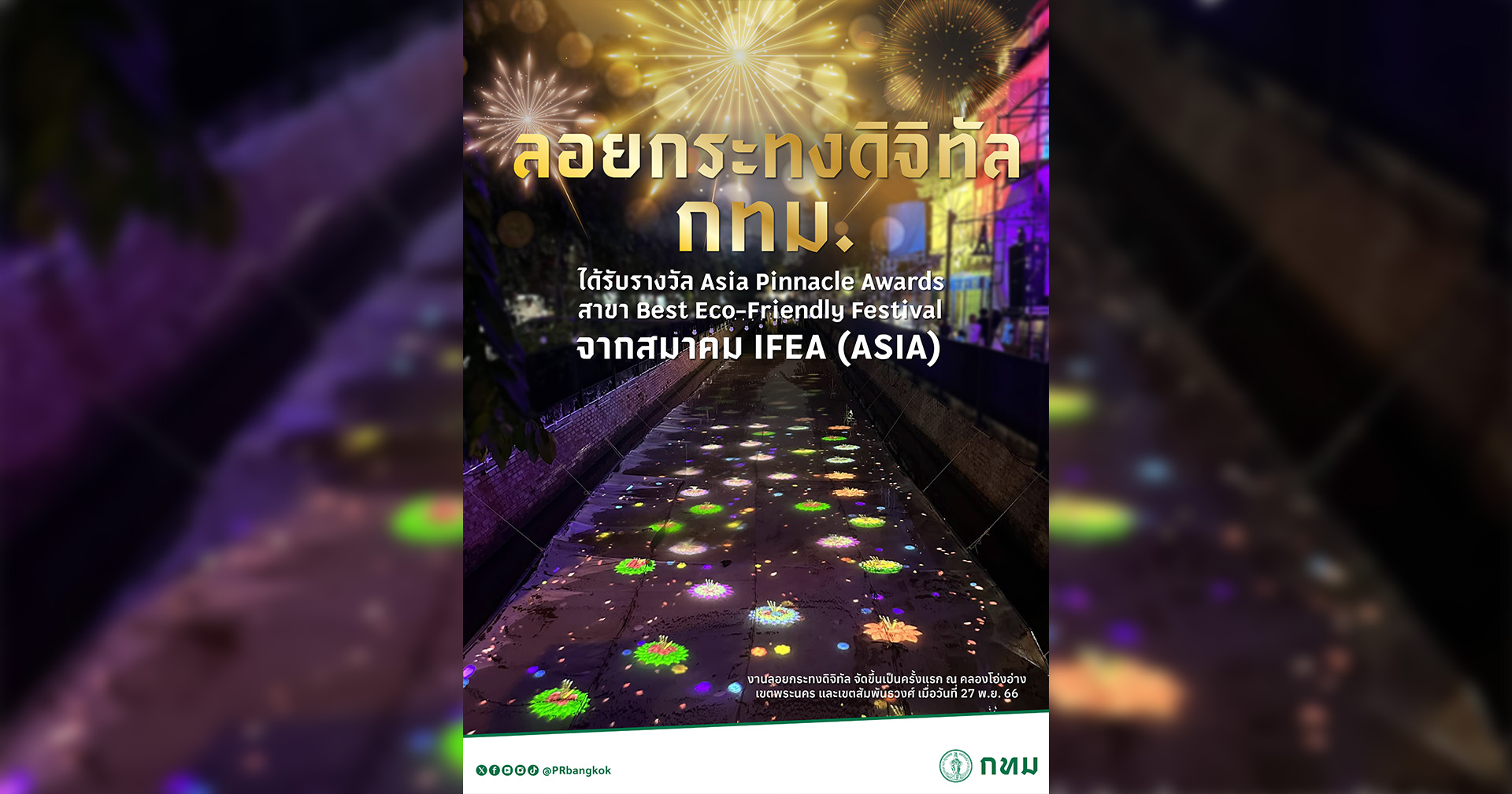 นายเอกวรัญญู อัมระปาล ผู้ช่วยเลขานุการผู้ว่าราชการกรุงเทพมหานคร และโฆษกของกรุงเทพมหานคร เปิดเผยว่า “งานลอยกระทงดิจิทัล กทม.” หรือ “Bangkok Digital Loy Krathong Festival” ซึ่งกรุงเทพมหานครจัดขึ้นเป็นครั้งแรก ณ คลองโอ่งอ่าง เขตพระนครและเขตสัมพันธวงศ์ เมื่อวันที่ 27 พ.ย. 66 ที่ผ่านมานั้น ได้ถูกคัดเลือกให้รับรางวัล Asia Pinnacle Awards สาขา Best Eco – Friendly Festival จากสมาคม IFEA (ASIA) หรือสมาคม The International Festivals and Events Association (สมาคมการจัดงานอีเวนท์และเทศกาลนานาชาติ) ซึ่งเป็นสมาคมที่ไม่แสวงหาผลกำไร ปัจจุบันมีสมาชิกจากทั่วโลกประมาณ 38 ประเทศ โดยแบ่งสมาชิกออกเป็น 7 ภูมิภาค คือ แอฟริกา เอเชีย ออสเตรเลียและนิวซีแลนด์ ยุโรป ลาตินอเมริกา ตะวันออกกลาง และอเมริกาเหนือ