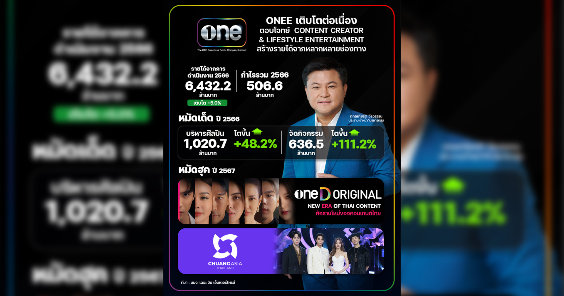 บริษัท เดอะ วัน เอ็นเตอร์ไพรส์ จำกัด (มหาชน) หรือ onee คอนเทนต์ครีเอเตอร์ครบวงจรชั้นนำของประเทศไทย ได้สรุปรายงานผลประกอบการประจำปี 2566 รวม 6,432.2 ล้านบาท กำไรสุทธิ 506.6 ล้านบาท เติบโต 303.8 ล้านบาท หรือ 5.0% จากปีก่อน ตอกย้ำกลยุทธ์ Content Creator & Lifestyle Entertainment ครบวงจร ที่มุ่งเน้นการสร้างรายได้จากหลากหลายช่องทางของความเชี่ยวชาญในหลากหลายสาขาของกลุ่มบริษัท ที่ไม่ได้ยึดแค่เพียงรายได้จากการโฆษณาพียงอย่างเดียว โดยมุ่งเน้นการสร้างสรรค์งานคอนเทนต์ที่ตอบโจทย์และครอบคลุมกลุ่มเป้าหมายที่หลากหลายยังคงเป็นหัวใจสำคัญในการที่จะเป็นแกนสร้างรายได้ทั้ง TV, Online, Copyright & Licensing และ Production Services ซึ่งถือเป็นจุดแข็งของกลุ่มบริษัท พร้อมด้วยธุรกิจ Idol Marketing ที่มีแผนพัฒนาศิลปินรวมถึงการสร้างศิลปินหน้าใหม่เป็น Idol Marketing และ Showbiz ที่ครอบคลุมทั้งการจัด Event, Fanmeet, Merchandisingอย่างครบวงจร ซึ่งจากโครงสร้างธุรกิจที่กล่าวมา บริษัทมั่นใจว่าจะสามารถเชื่อมโยงจุดเด่นของกลุ่มบริษัท ให้เข้ากับเทรนด์ของอุตสาหกรรมและเข้าถึงผู้บริโภคทุกกลุ่มเป้าหมายทั้งเพื่อสร้างการเติบโตของรายได้ในทุกช่องทาง ทั้งในประเทศและต่างประเทศ