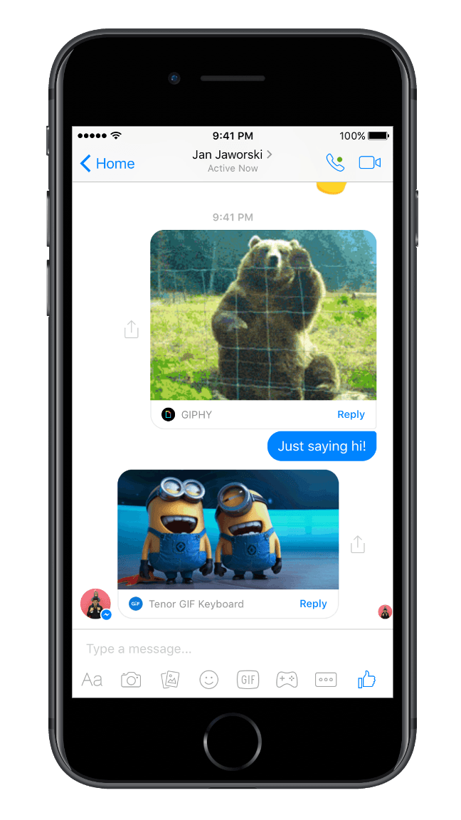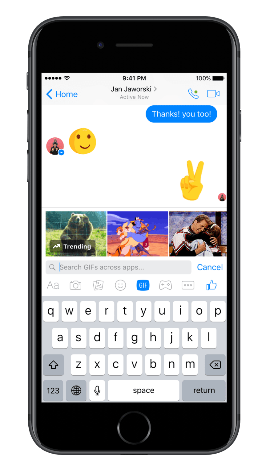 เมสเซนเจอร์จะเลือกสรรภาพเคลื่อนไหว (GIF) ที่เหมาะกับธีมมิตรภาพโดยเฉพาะ ให้ผู้ใช้ได้เริ่มทักทายเพื่อนๆ อย่างสนุกสนานและง่ายดาย