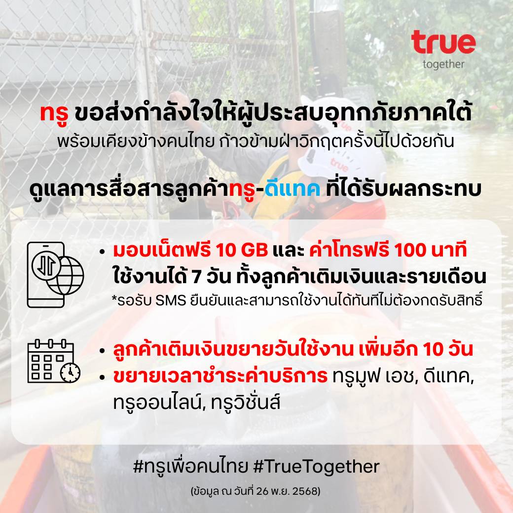 ท่ามกลางสถานการณ์อุทกภัยครั้งใหญ่ที่กำลังโหมกระหน่ำหลายจังหวัดในภาคใต้ ไม่ว่าจะเป็น สงขลา (หาดใหญ่), สตูล, ปัตตานี, ยะลา และนราธิวาส ที่ส่งผลกระทบต่อวิถีชีวิตและการคมนาคมอย่างหนัก ทรู คอร์ปอเรชั่น ในฐานะ Tech Company ของไทย ได้ประกาศเดินหน้าภารกิจเร่งด่วน โดยนำศักยภาพทางเทคโนโลยีดิจิทัลมาเป็น “สะพาน” เชื่อมต่อความช่วยเหลือ เพื่อก้าวข้ามวิกฤตครั้งนี้ไปด้วยกัน ผ่าน 4 ภารกิจหลักที่ครอบคลุมทั้งกายภาพและการสื่อสาร