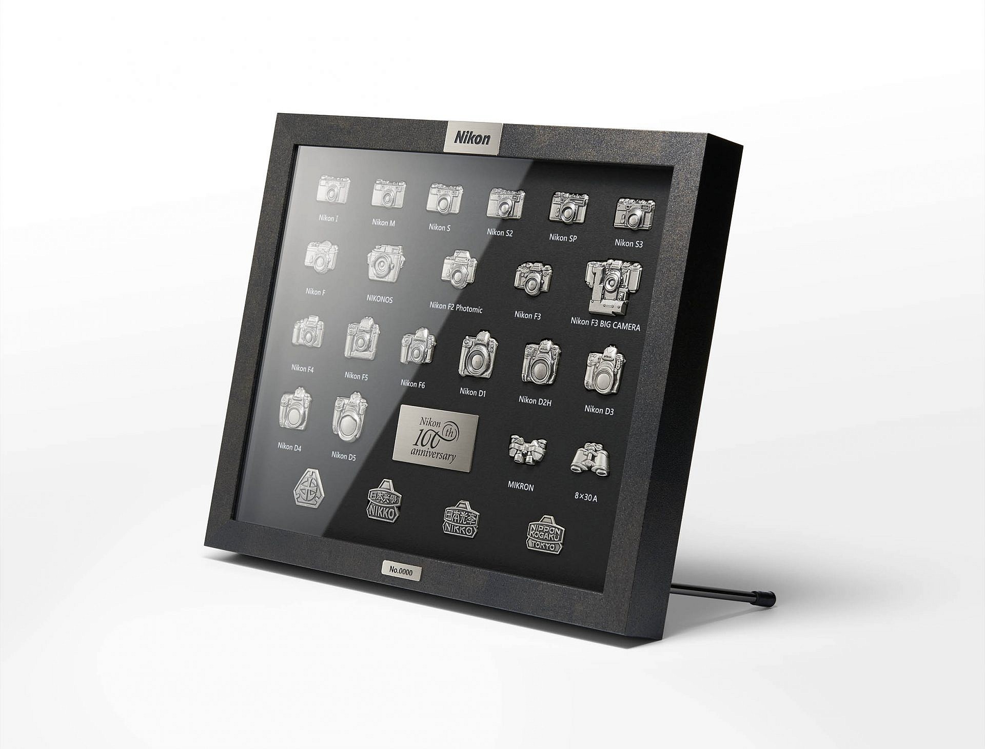 เข็มกลัดคอลเล็คชั่นพิเศษนี้ประกอบด้วยผลิตภัณฑ์ที่แสดงถึงประวัติศาสตร์และมีชื่อเสียงโด่งดังรุ่นต่างๆ รวมถึงตราสัญลักษณ์ของบริษัท ในรูปแบบที่สะท้อนแนวคิดในอดีตผ่านเส้นทางแห่ง 100 ปีของนิคอน