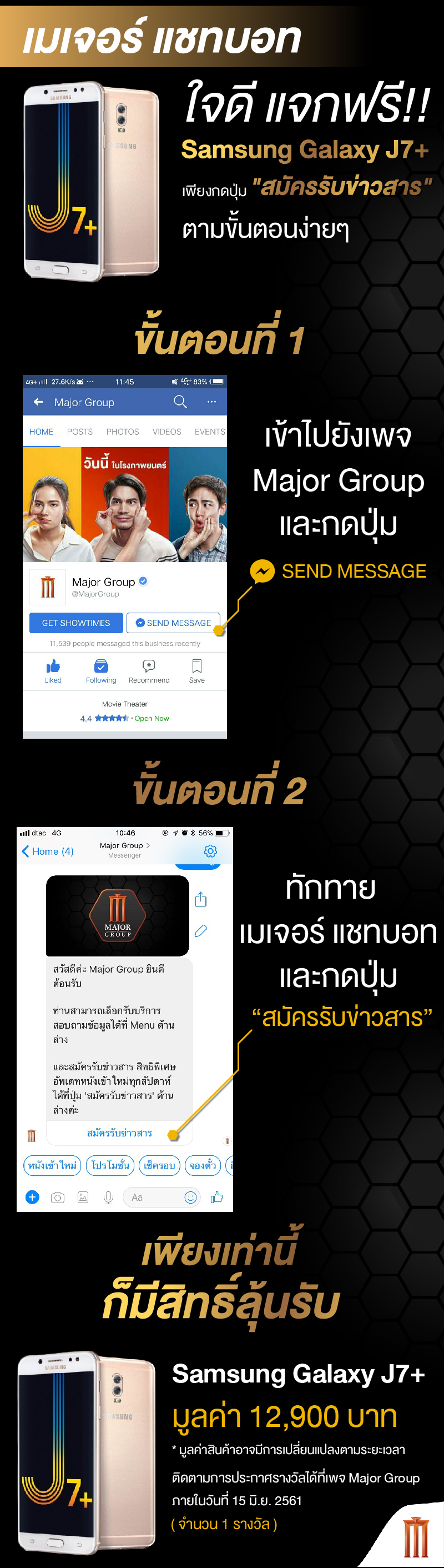 พิเศษ…ช่วงแนะนำเปิดให้บริการใหม่ ตั้งแต่วันที่ 25 พฤษภาคม – 15 มิถุนายน 2561 ผู้สมัครกดรับข่าวสารผ่าน เมเจอร์ แชทบอท ลุ้นรับโทรศัพท์มือถือ Samsung Galaxy J7+ มูลค่า 12,900 บาท 1 รางวัล