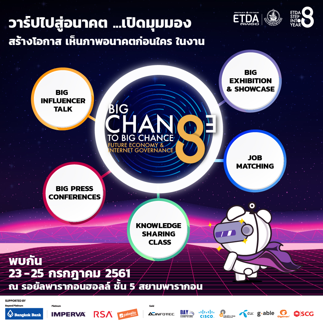 #ETDATHAILAND #8ปีETDA #8ปีสพธอ #ETDAStepIntoYear8 #BigChange2018 #BigChangetoBigChance #FutureEconomy #InternetGovernancernance #WarpToTheFuture #วาร์ปไปสู่อนาคต