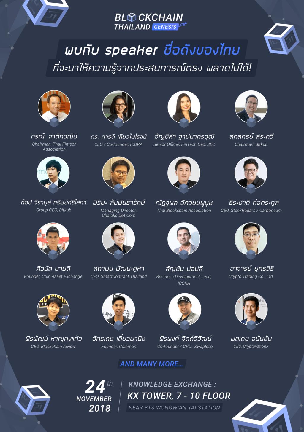 เตรียมตัวให้พร้อมกับ Blockchain Thailand Genesis งานสัมมนา Blockchain งานแรกที่จัดโดยคนไทยแท้ๆ!! ในวันเสาร์ที่ 24 พฤศจิกายน 2018 อาคาร KX Tower ชั้น 7-10 เวลา 9.30 – 18.00 น โดยในงานจะรวมพลทั้งเหล่า Speaker ชื่อดัง และผู้มีชื่อเสียงในวงการมากมาย ที่จะมาให้ความรู้ในเรื่องของ Blockchain และ Cryptocurrency พร้อมทั้งเผยทิศทางการลงทุน และแนวโน้มการเติบโตของโลก Blockchain และ Cryptocurrency ที่จะมีบทบาทมากยิ่งขึ้นในอนาคตอันใกล้ รวมไปถึง Workshop ที่จะทำให้มือใหม่ได้ลองลงสนามเพื่อทำให้เข้าใจและเข้าถึงโลก Cryptocurrency ได้ดียิ่งขึ้น