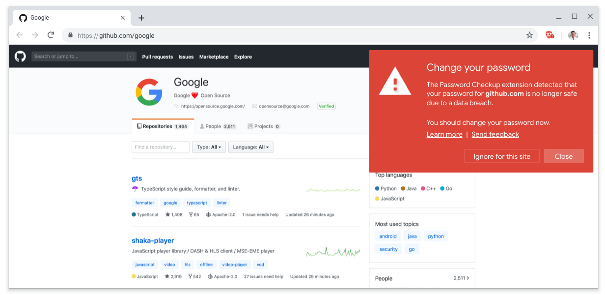 เมื่อเดือนกุมภาพันธ์ที่ผ่านมา Google ได้เปิดตัวส่วนขยายสำหรับการตรวจสอบรหัสผ่านที่เรียกว่า Password Checkup ซึ่งเป็นส่วนขยายของ Chrome เพื่อช่วยให้บัญชีออนไลน์ทั้งหมดของผู้ใช้ปลอดภัยจากการไฮแจ็ก ส่วนขยายนี้จะแสดงการแจ้งเตือนทุกครั้งที่มีการลงชื่อเข้าใช้เว็บไซต์โดยอ้างอิงจากชื่อผู้ใช้และรหัสผ่านมากกว่า 4 พันล้านรายการที่ Google ได้ทำการตรวจสอบแล้วว่าไม่ปลอดภัยเนื่องจากการละเมิดข้อมูลส่วนบุคคล นับตั้งแต่การเปิดตัวมีผู้ทดลองใช้ส่วนขยายนี้มากกว่า 650,000 คน เฉพาะในเดือนแรกของการเปิดตัวมีการตรวจสอบชื่อผู้ใช้และรหัสผ่านมากถึง 21 ล้านรายการ และตรวจพบชื่อผู้ใช้และรหัสผ่านที่ไม่ปลอดภัยมากกว่า 316,000 รายการ โดย 1.5% ของการลงชื่อเข้าใช้ได้รับการสแกนโดยส่วนขยายดังกล่าว