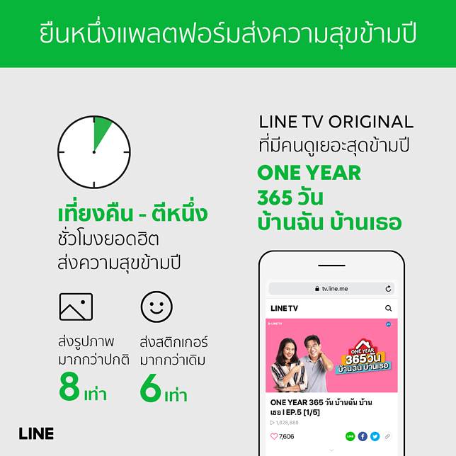 ในช่วงปีใหม่ที่ผ่านมา ซีรี่ส์ One Year 365 วันบ้านฉันบ้านเธอกลายเป็นคอนเทนต์ Original จากไลน์ที่มีผู้ชมมากที่สุดในช่วงเวลาข้ามปี จากสถิตนี้เผยให้เห็นว่าคนไทยนิยมใช้การสื่อสารผ่านระบบอินเตอร์เน็ตเป็นส่วนใหญ่ โดยเลือกใช้แอปพลิเคชันไลน์ที่มีการสื่อสารทำได้หลายรูปแบบไม่ว่าจะเป็น การคุยผ่านข้อความ หรือจะเป็นการใช้งาน Line Call ที่สะดวกสบายมากกว่า และการส่งสติกเกอร์ที่มีสถิติการใช้งานเพิ่มขึ้น