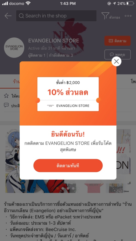 โปรโมชันสุดพิเศษ เพื่อเฉลิมฉลองการเปิดร้าน “EVANGELION STORE” อย่างเป็นทางการ ทางร้านขอมอบคูปองส่วนลด 10% สำหรับผู้ที่กดติดตามร้าน “EVANGELION STORE” บน Shopee ประเทศไทย