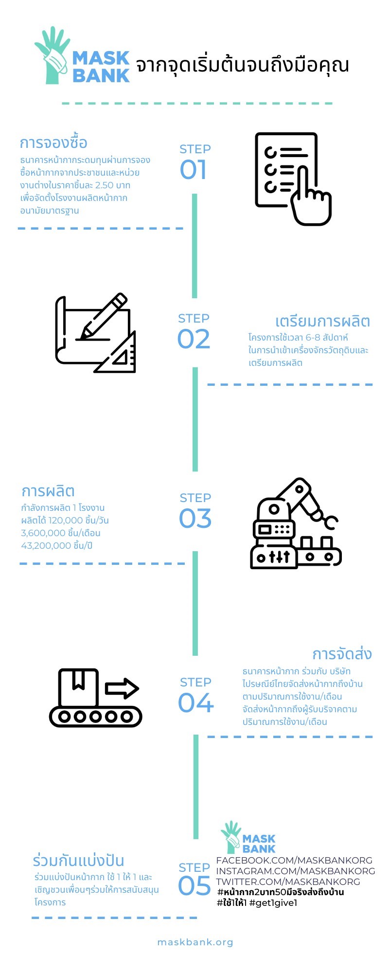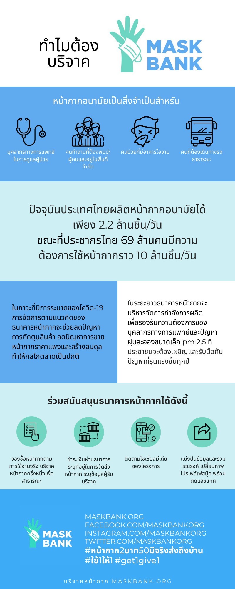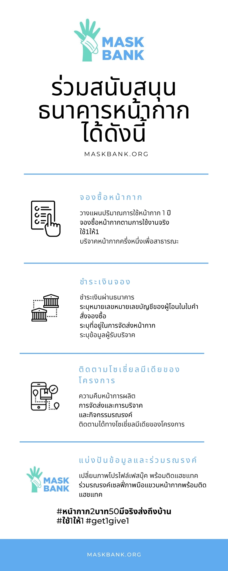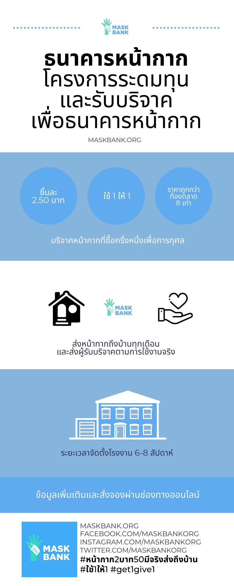 เปิดตัว Mask Bank โครงการธนาคารหน้ากากระดมทุนสาธารณะและรับบริจาคเพื่อจัดหาหน้ากากอนามัย ให้ประชาชนจองซื้อได้ในราคาชิ้นละ 2.50 บาทไม่จำกัดจำนวนตามความจําเป็นที่ต้องใช้จริงส่งถึงบ้านฟรีทุกเดือน โดยให้ซื้อใช้เองพร้อมซื้อบริจาคในสัดส่วน1ต่อ1 เพื่อสร้างสังคมแห่งการแบ่งปัน ภายใต้แคมเปญการรณรงค์ #หน้ากาก2บาท50มีจริงส่งถึงบ้าน #ใช้1ให้1 #get1give1