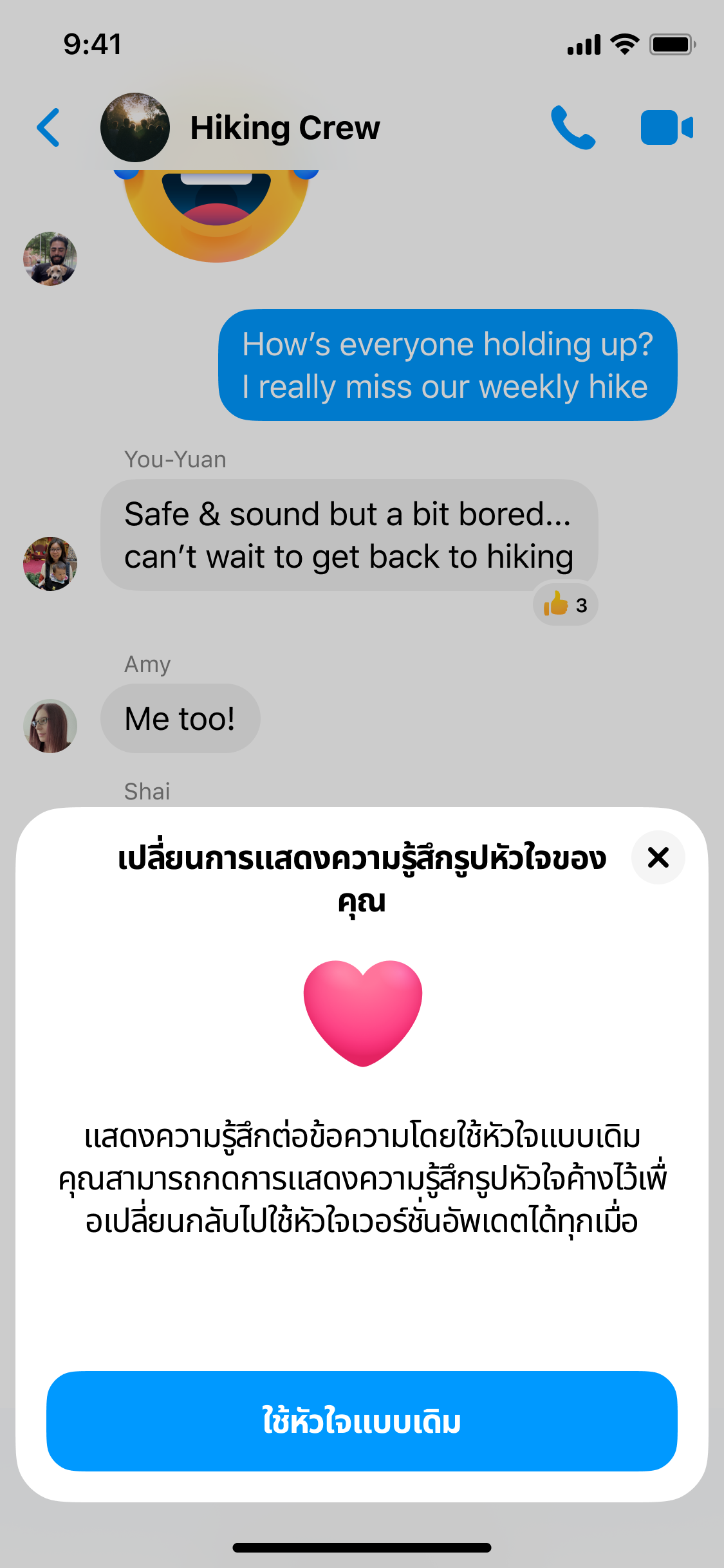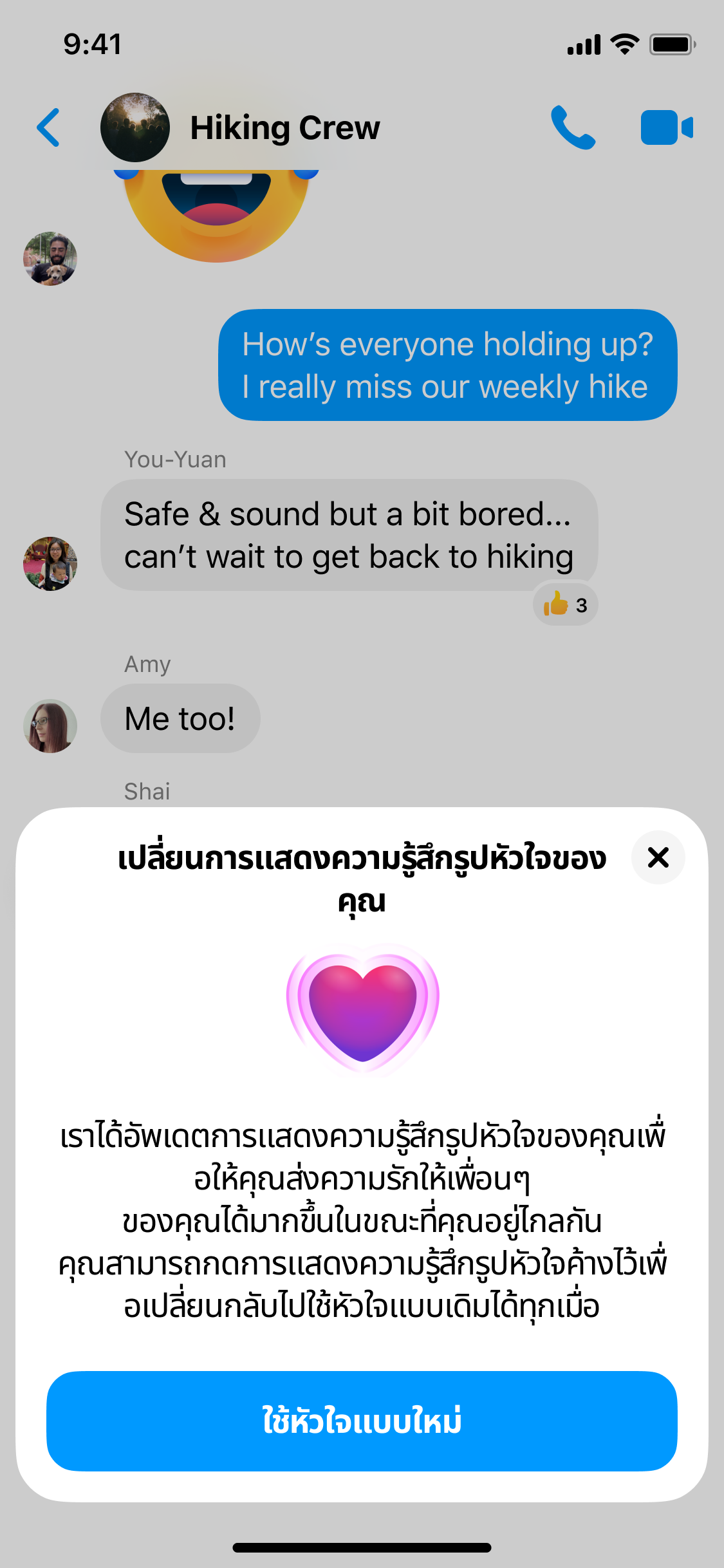 - ในการอัพเดตไอคอนหัวใจแบบใหม่เพื่อแสดงความรู้สึกบน Messenger คุณสามารถกดค้างที่ปุ่มแสดงความรู้สึกรูปหัวใจเพื่อดูปุ่มแสดงความรู้สึกอันใหม่ และคุณสามารถกดค้างที่ปุ่มแสดงความรู้สึกอันใหม่นั้นเพื่อเปลี่ยนกลับเช่นเดิม