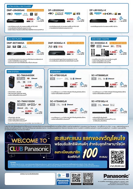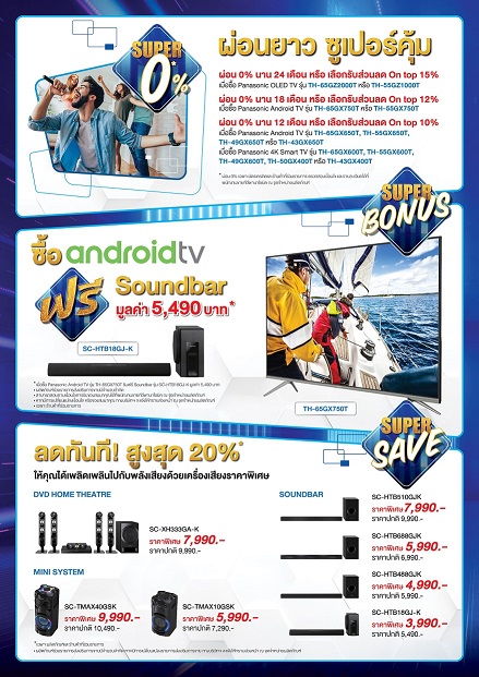 พร้อมเติมเต็มความบันเทิงให้ครบทุกอรรถรสกับโปร SUPER BONUS เพียงซื้อ Panasonic Android TV รุ่น TH-65GX750T รับฟรี! Soundbar รุ่น SC-HTB18GJ-K มูลค่า 5,490 บาท และห้ามพลาดกับข้อเสนอพิเศษกับโปร SUPER SAVE ที่พานาโซนิคพร้อมมอบส่วนลดทันที สูงสุดถึง 20% ให้คุณได้เพลิดเพลินไปกับพลังเสียงด้วยเครื่องเสียงราคาพิเศษ ไม่ว่าจะเป็น DVD HOME THEATRE*, SOUNDBAR*, MINI SYSTEM* (*เฉพาะรุ่นที่ร่วมรายการ)