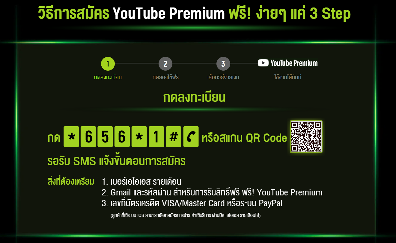 โดยมอบสิทธิพิเศษดังกล่าว ให้กับผู้ใช้บริการเอไอเอสรายเดือนปัจจุบัน ที่จดทะเบียนในนามบุคคลธรรมดา จำนวนกว่า 7 ล้านราย รับสิทธิ์ง่ายๆ เพียงกด *656*1# โทรออก รอรับ SMS แจ้งขั้นตอนการสมัคร ทั้งนี้ สำหรับลูกค้าเอไอเอสรายเดือนที่ใช้แพ็กเกจรายเดือน 699 บาทขึ้นไป รับสิทธิพิเศษดูวีดิโอบน YouTube แบบไม่มีโฆษณาคั่น ผ่านมือถือ ด้วย YouTube Premium ฟรี นาน 6 เดือน (มูลค่าสูงสุดถึง 1,254 บาท เนื่องจาก ค่าใช้บริการ YouTube Premium ระบบแอนดรอยด์ 159 บาท, ระบบ iOS 209 บาท)