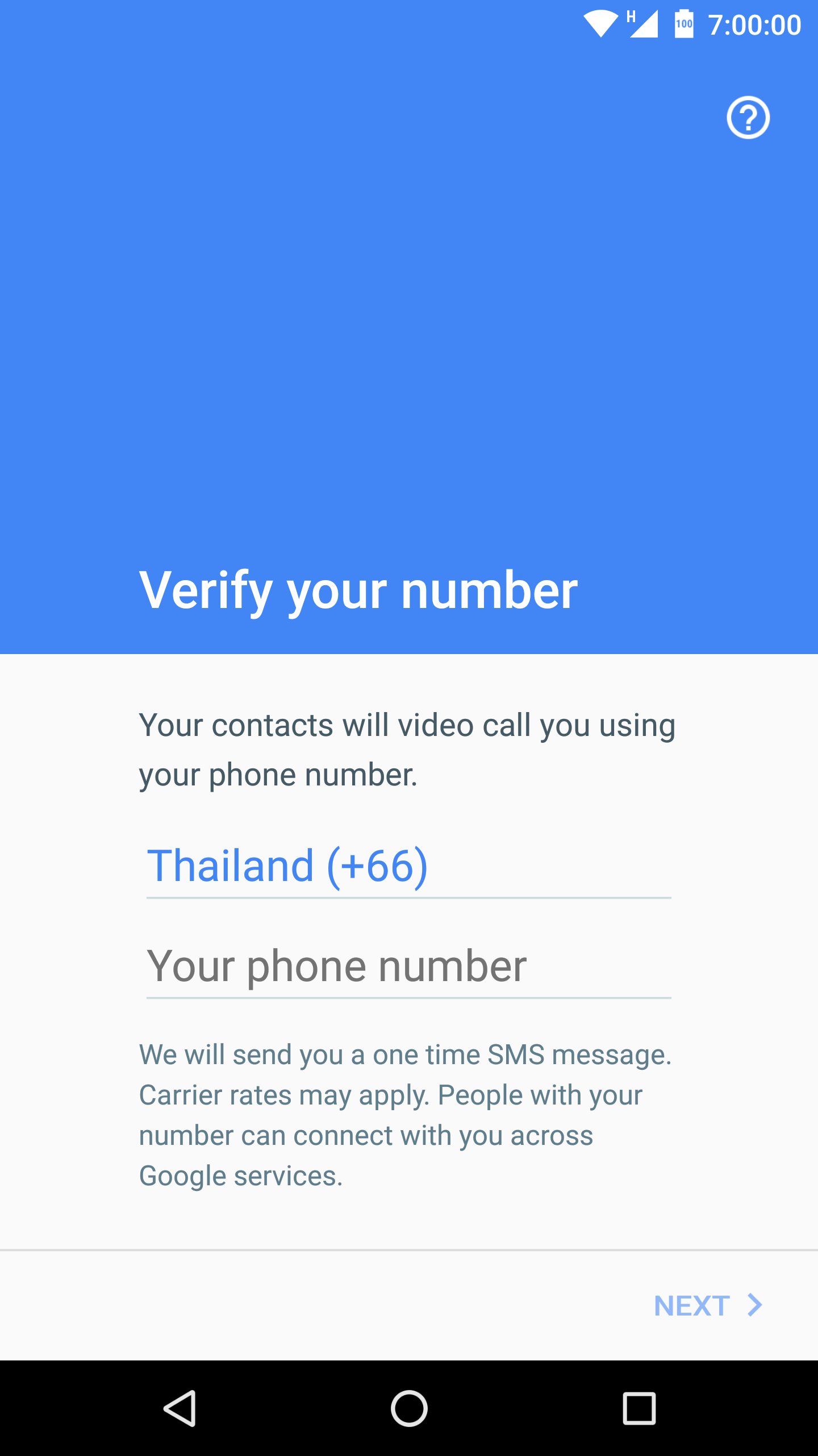หลังจากทำขั้นตอนข้างต้นเสร็จเรียบร้อยแล้ว ให้ใส่เบอร์โทรศัพท์เพื่อใช้งานผูกกับแอป Google Duo โดยหลังจากกด Next แล้ว ทาง Google ก็จะส่งรหัส OTP เพื่อใส่ยืนยันมาให้ทาง SMS จากนั้นก็กรอกยืนยันได้เลย