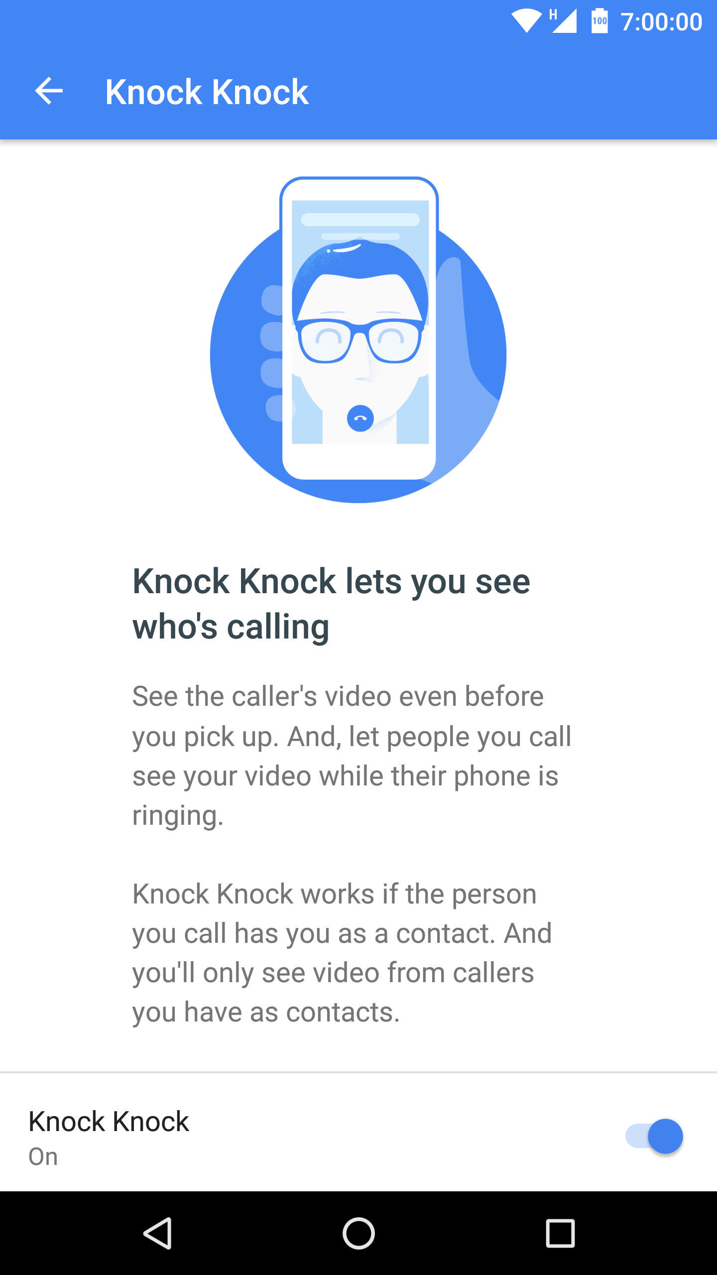 ฟีเจอร์ที่คนส่วนใหญ่มักจะนึดถึงเมื่อพูดถึงแอป Google Duo นั้นก็จะเป็นฟีเจอร์ “Knock Knock” ฟีเจอร์ที่จะทำให้เราสามารถเห็นอีกฝ่ายหนึ่งที่เป็นฝ่ายที่โทรเข้ามาก่อน แม้เรายังไม่ได้รับสายก็ตาม และสำหรับการรับสายนั้นเพียงแค่ลากปุ่มกล้องวีดีโอขึ้นเข้านั้น ส่วนการวางสายเพียงแค่ลากลง