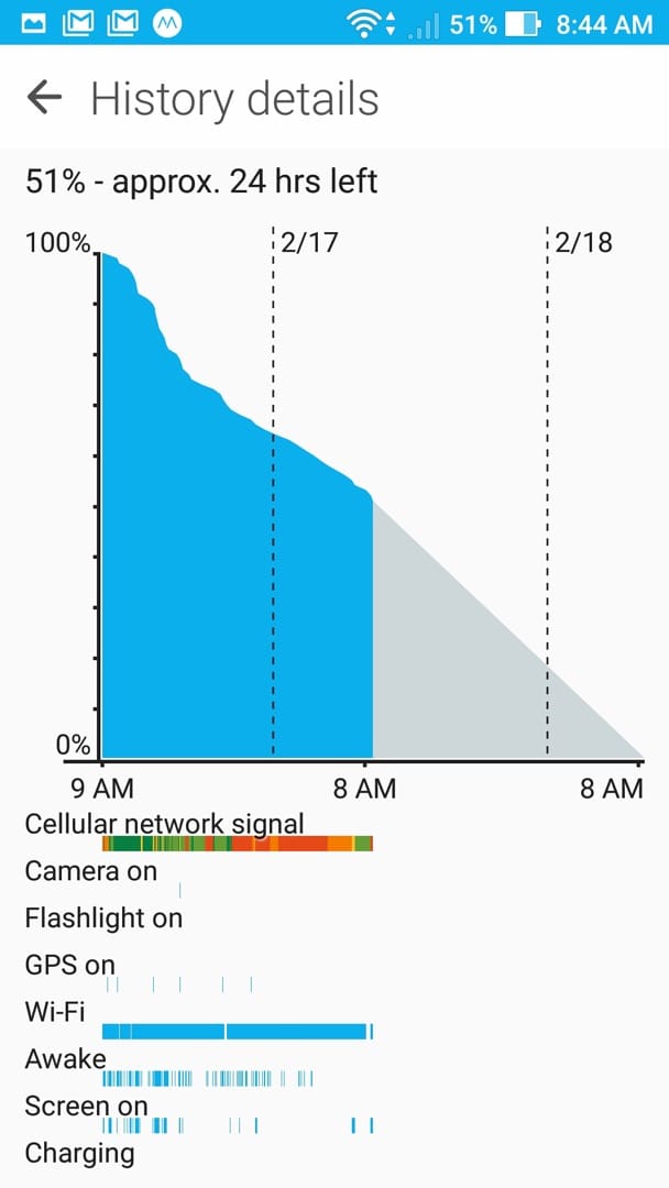 รูปซ้ายคือช่วงก่อนนอนของคืนวันที่ 16 และรูปขวาคือช่วงตื่นนอนของวันที่ 17 จะเห็นว่าแบตเตอรี่หายไป 14% ใน 1 คืน ซึ่งเมื่อดูกราฟจากภาพขวาจะเห็นสัญญาณโทรศัพท์บนคอนโดนั้นอ่อนตลอดทั้งคืน และการมีเชื่อม Wifi ตลอดเวลา