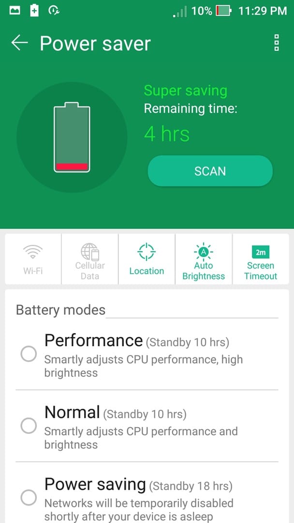 เมื่อแบตเตอรี่เหลือ 10% โหมด Super Saving จึงทำงานขึ้นมาอัตโนมัติ เพื่อทำให้โทรศัพท์ใช้งานได้ยาวนานที่สุด โดยยกเลิกการเชื่อมต่อข้อมูลทั้ง 3G/4G/Wifi เหลือแต่การรับสายและโทรออกเท่านั้น แต่ในโหมดนี้ก็ยังใช้งานกล้อง หรือเล่นเกมได้ตามปกติ