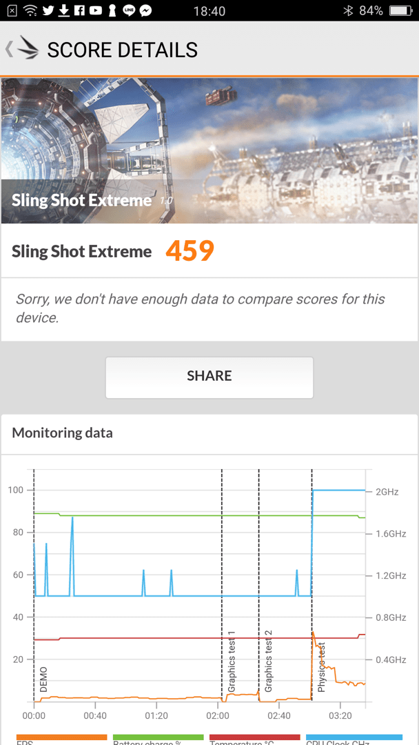 ทดสอบประสิทธิภาพ 3Dmark ทดสอบ Sling Shot Extreme ได้ 459 คะแนน เทียบกับ iPhone 7 ที่ได้ 2,025 คะแนน, Huawei P9 ได้ 726 คะแนน, Samsung Galaxy S8 ได้ 3,294 คะแนน