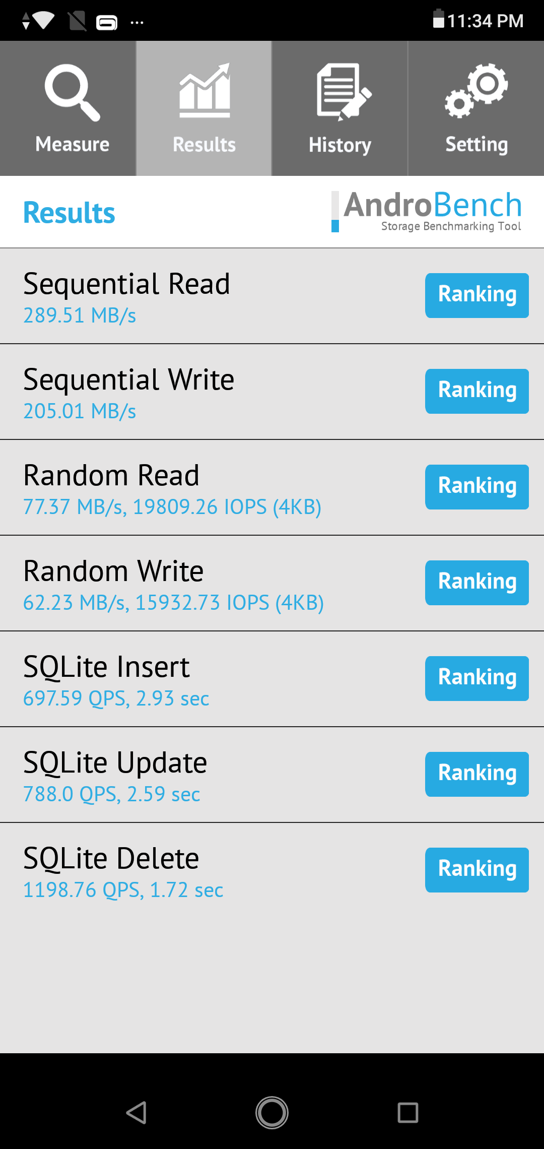 - และคะแนนความเร็วในการอ่านจาก AndroBench อยู่ที่ 290 MB/s สำหรับการอ่านต่อเนื่อง