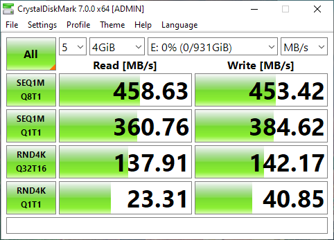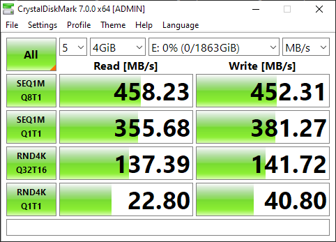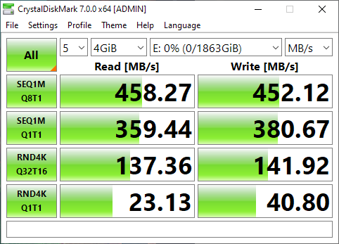 | Seagate UltraTouch SSD | 469.85 MB/s | 395.80 MB/s | 21.49 MB/s | 19.62 MB/s |