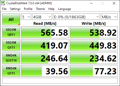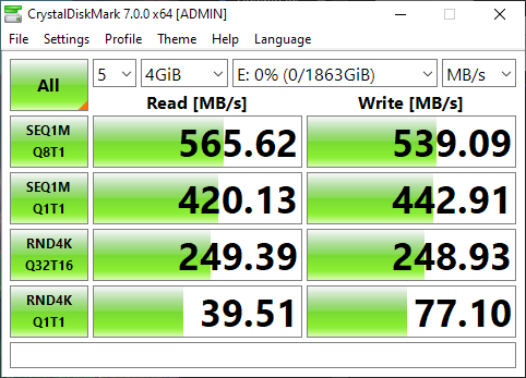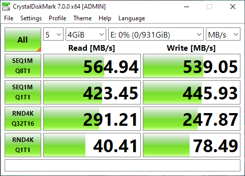 | Seagate BarraCuda Fast SSD | 564.94 MB/s | 539.05 MB/s | 40.41 MB/s | 78.49 MB/s |