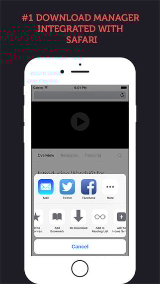 ในบางครั้งผู้ใช้บางคนต้องการเจลเบรกอุปกรณ์ iOS ต่างๆ เพื่อที่จะหาดาวน์โหลดตัวปรับแต่งสำหรับการดาวน์โหลดไฟล์ต่างๆในบราวเซอร์ Safari ซึ่งในตอนนี้ก็มีทางเลือกใหม่สำหรับการดาวน์โหลดแล้ว แต่ในคราวนี้ไม่ต้องผ่านการเจลเบรกเครื่องเลย เพียงแค่ดาวน์โหลดแอพจาก App Store โดยแอพใช้ชื่อว่า Mr Download ซึ่งแอพนี้เพิ่งได้ปล่อยใน App Store ในช่วงปลายปีที่ผ่านมาโดยจะสามารถดาวน์โหลดไฟล์ได้โดยตรงจากบราวเซอร์ Safari และยังรวมถึงแอพต่างๆอีกด้วย