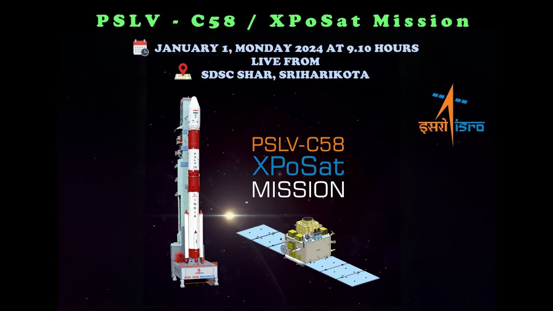 องค์การวิจัยอวกาศอินเดีย (ISRO) กำลังจะปล่อยภารกิจ XPoSat ในการส่งดาวเทียมเอ็กซ์เรย์โพลาริมิเตอร์ไปยังวงโคจรระดับต่ำของโลก ที่ขับดันด้วยจรวด PSLV-C58 ออกจากแท่นปล่อยจรวดที่ 1 (FLP) ณ ศูนย์อวกาศสาทิศธาวัน (Satish Dhawan Space Center : SDSC) เกาะศรีหริโกตา รัฐอานธรประเทศ ในวันจันทร์ที่ 1 มกราคม เวลา 09.10 น. (10.00 น. ในประเทศไทย) และเป็นเที่ยวบินที่ 60 ของจรวดในตระกูล PSLV