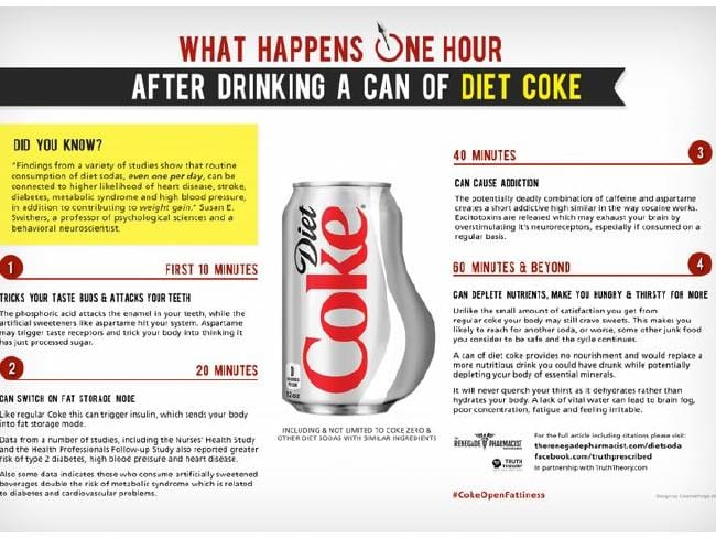 - หลังจากดื่ม 10 นาที กรด phosphoric จะส่งผลกับฟัน และ สารเคลือบฟันของคุณ ในขณะที่สารให้ความหวานเทียมอย่าง aspartame ก็จะส่งผลต่อระบบการรับรสของคุณ ส่งผลให้ต่อมรับรสของคุณคิดว่าคุณกำลังรับประทานน้ำตาลทรายอยู่