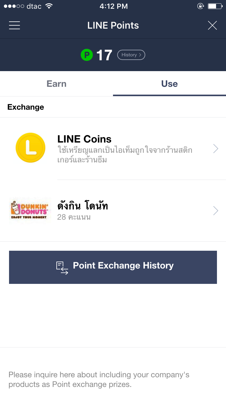 เมื่อได้แต้มมาแล้วให้กดที่ USE คือการใช้แต้ม เท่าที่เห็นตอนนี้มีเพียงแลกแต้มเป็นเหรียญ และโปรโมชั่นพิเศษของ Dunkin Donut ครับ