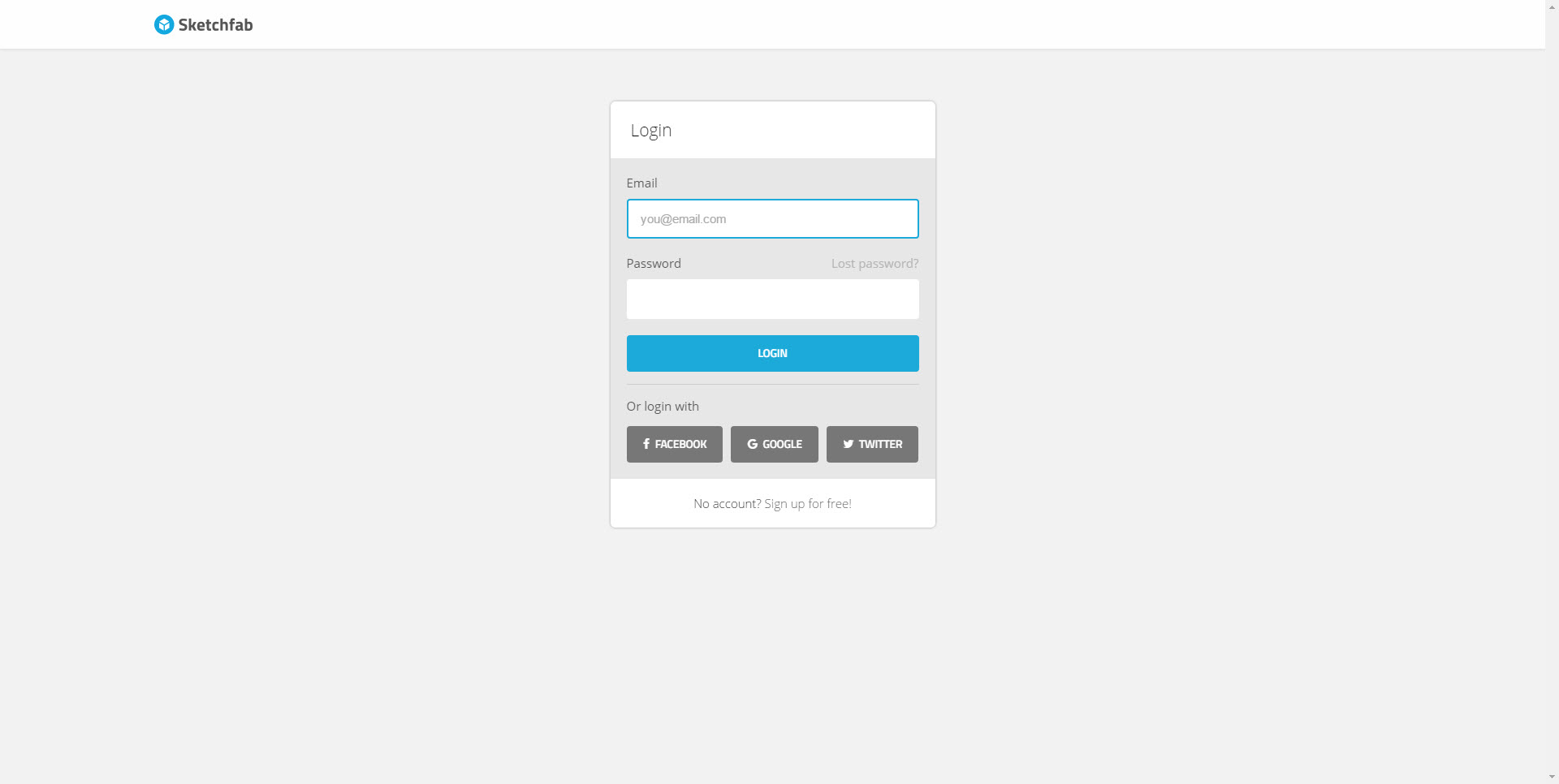 ขั้นตอนที่ 4 : เข้าสู่ระบบบัญชี Sketchfab หรือถ้าใครยังไม่มีก็สามารถกดสมัครได้ รวมถึงยังสามารถกดเข้าสู่ระบบผ่าน Facebook, Google หรือ Twitter ก็ได้