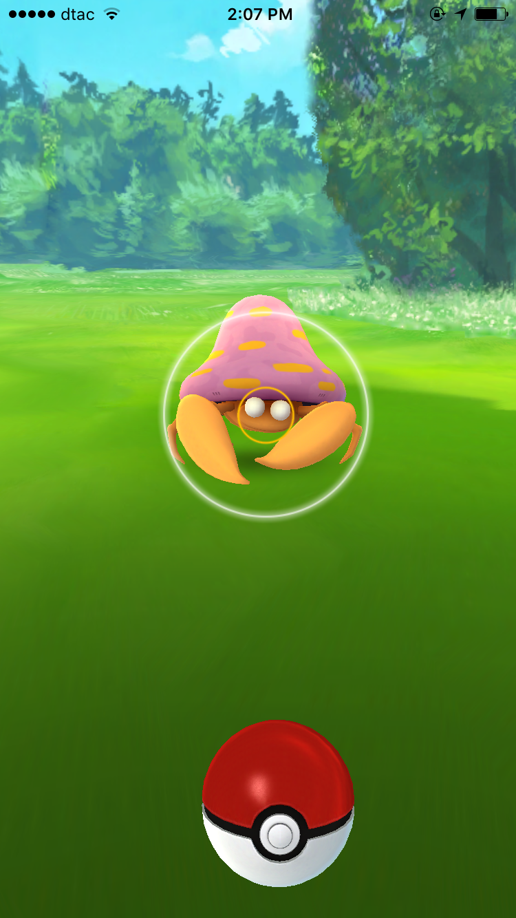 ตอนที่เรากดลูกบอลค้างไว้ สังเกตุว่าจะมีวงกลมอีกหนึ่งวงที่เป็นสีๆ นอกจากวงกลมสีเทาที่อยู่นอกรอบเคลื่อนตัวเขาหาโปเกม่อน วงกลมนั้นแหละครับ ยิ่งมันเล็กมากเท่าไหร่จะยิ่งจับง่ายมากขึ้นเท่านั้น