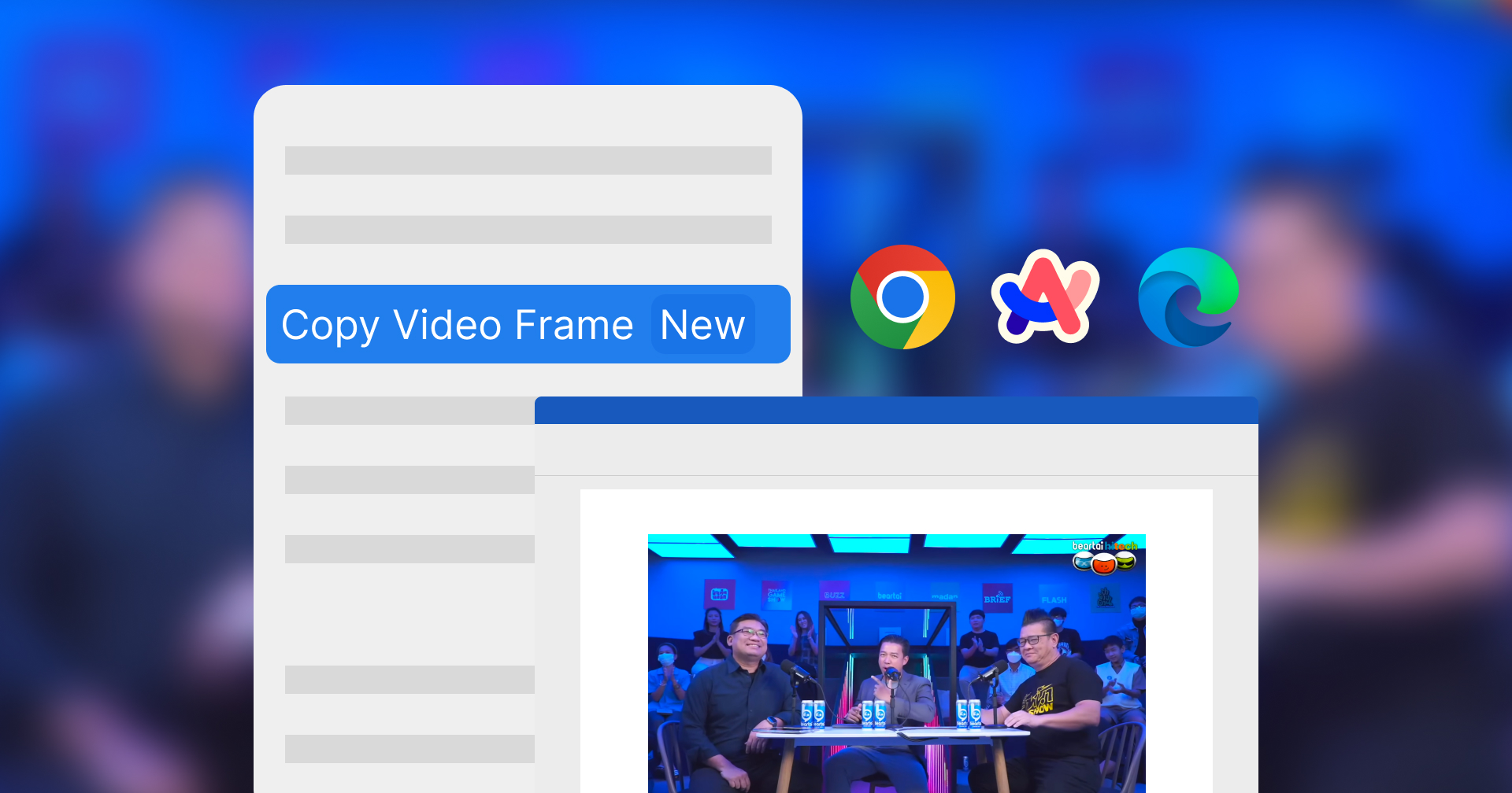 ใน Google Chrome หรือเบราว์เซอร์ที่สร้างขึ้นจากโครงการ Chromium ไม่ว่าจะเป็น Microsoft Edge หรือ Arc Browser รุ่นล่าสุดนั้น มีการเพิ่มตัวเลือกหนึ่งเพิ่มขึ้นมาคือ ‘Copy Video Frame’ หรือ ‘คัดลอกเฟรมวิดีโอ’ ให้ผู้ใช้สามารถคัดลอกเฟรมวิดีโอออกมาแบบง่าย ๆ