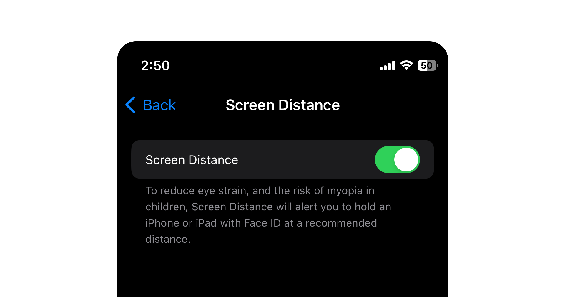 ฟีเจอร์ ‘Screen Distance’ จะใช้เซนเซอร์ TrueDepth ของกล้องหน้า iPhone และ iPad Pro มาตรวจจับระยะสายตาระหว่างอุปกรณ์ เมื่อผู้ใช้อยู่ใกล้หน้าจอกว่า 12 นิ้วเป็นระยะเวลานานกว่า 20 นาทีอุปกรณ์แจ้งเตือนให้เลื่อน และถอยห่างหน้าจอเพิ่มขึ้น ซึ่งจะมาช่วยถนอมสายตา และลดอาการตาล้าได้